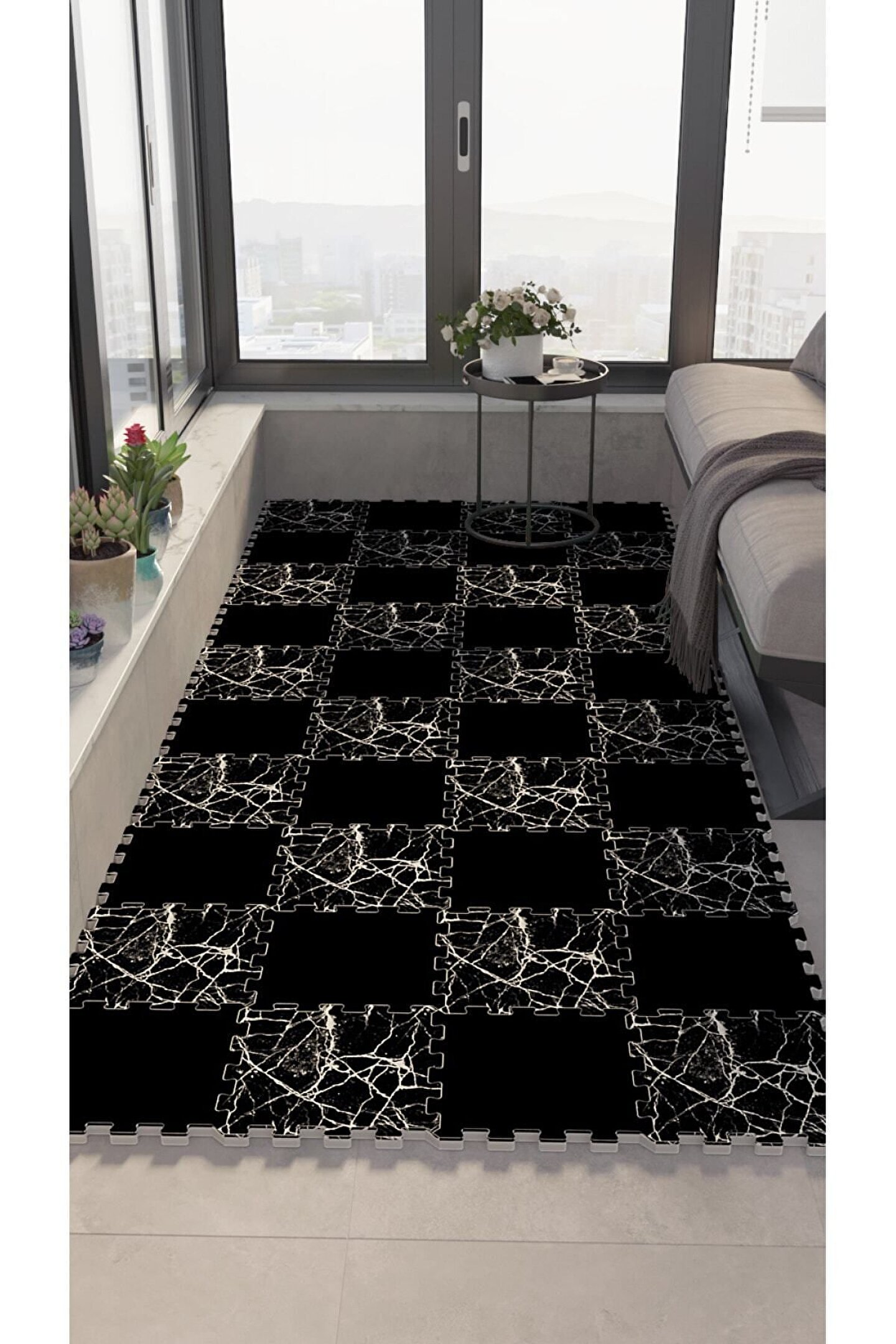 Tokyo Halı Siyah Mermer Desenli Su Geçirmez Balkon Halısı Thb30 | Yapboz Halı | Puzzle Halı