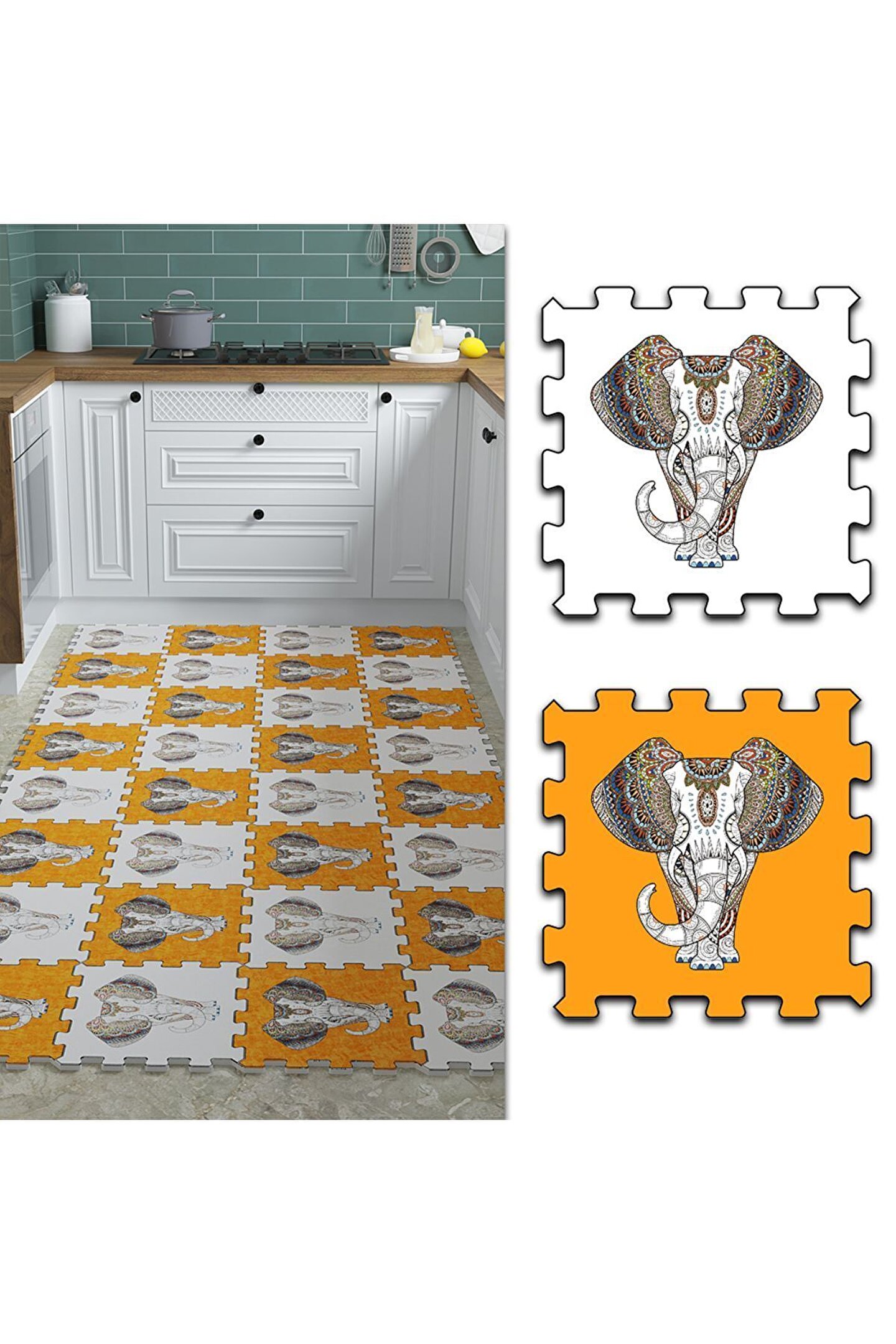 Turuncu Filli Yıkanabilir Mutfak Halısı Thm23 | Yapboz Halı | Puzzle Halı