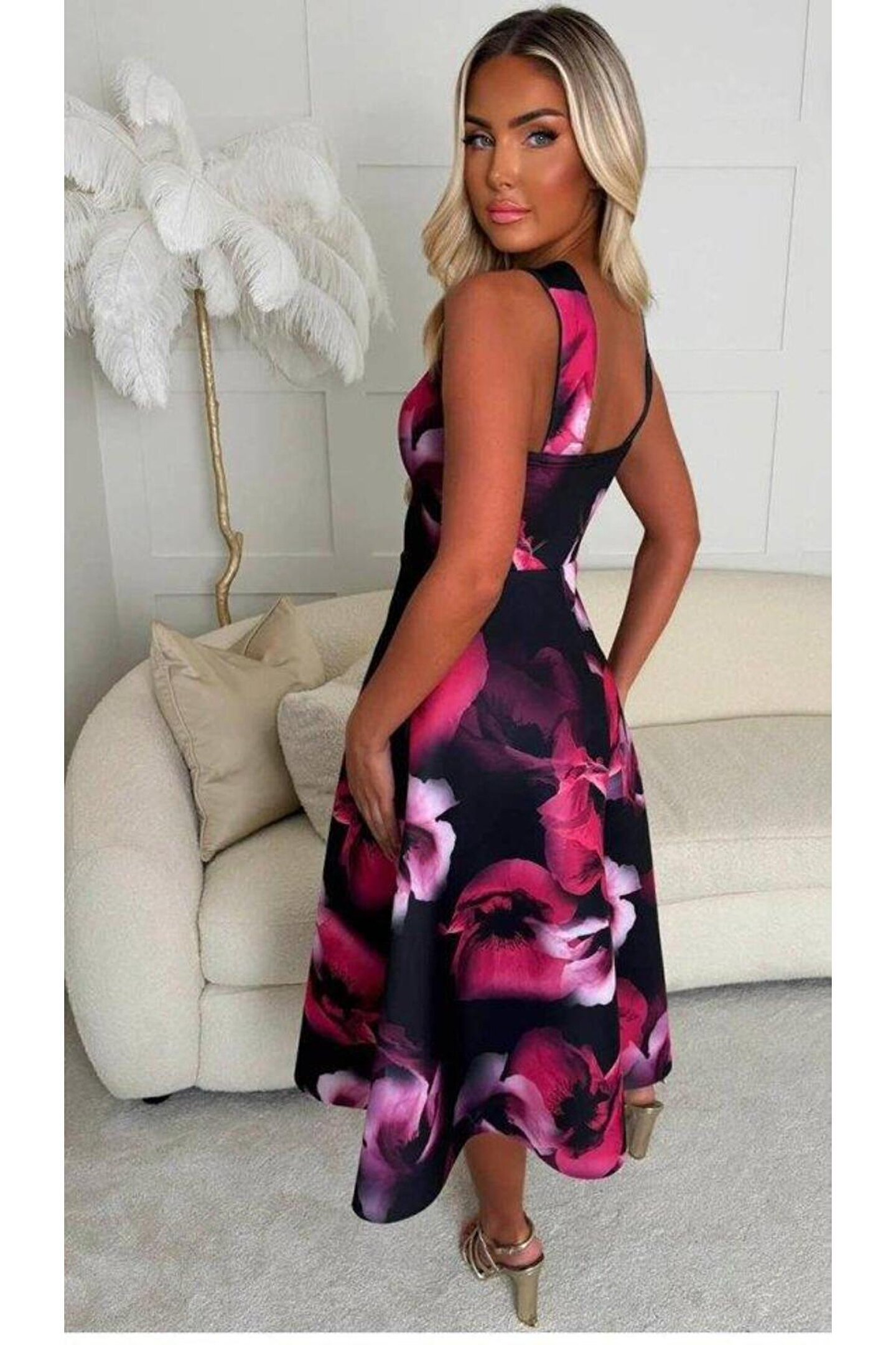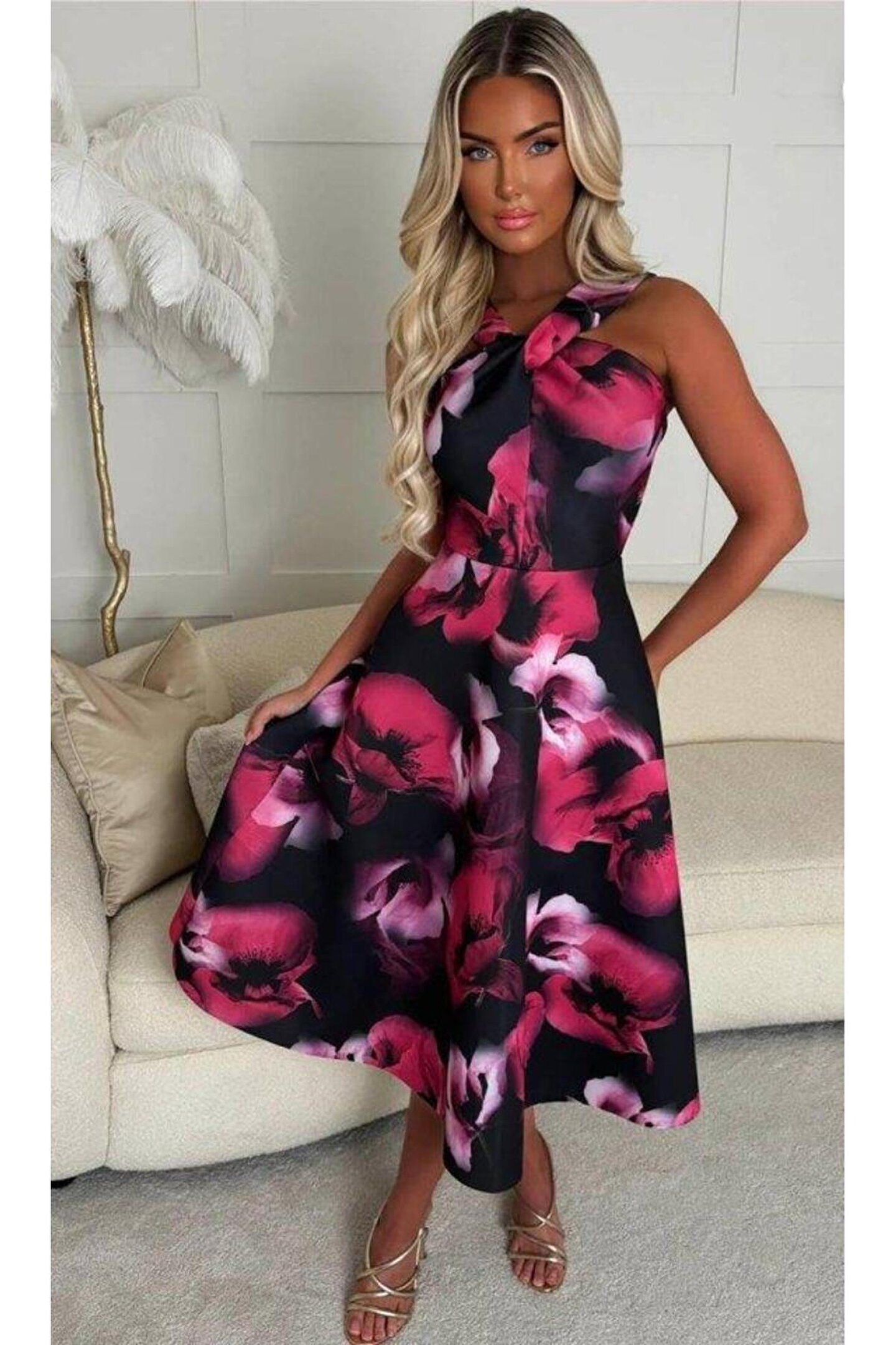 Kadın Halter Yaka Detay Ciçek Baskılı Midi Boy Elbise