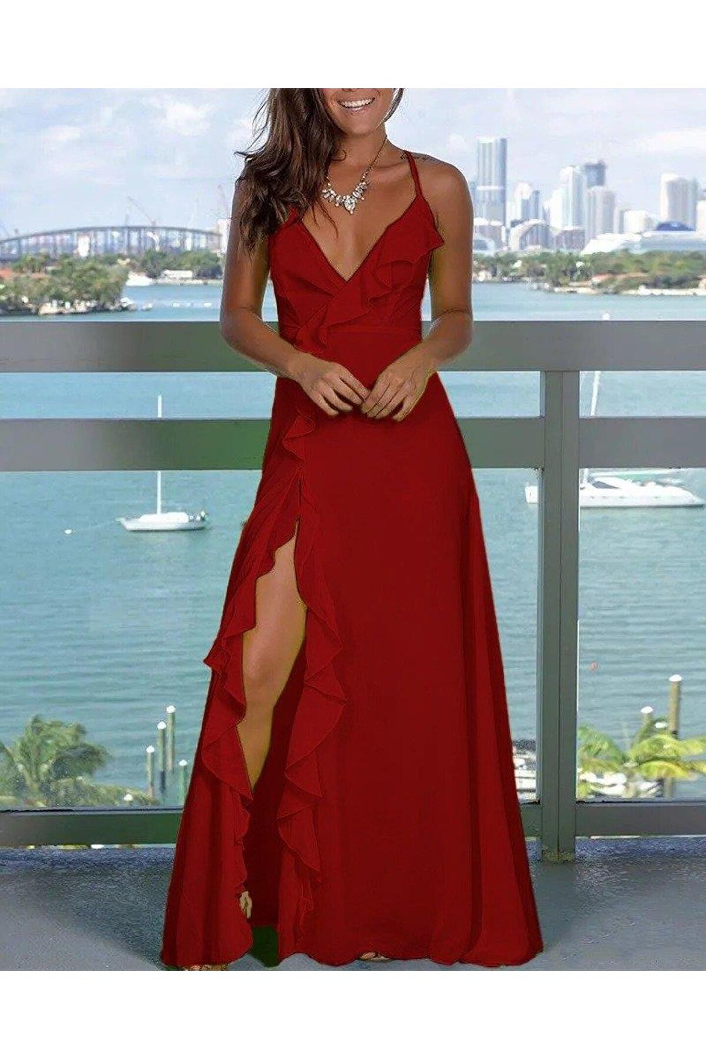 Kadın Ip Askılı Dekolteli Yırtmaç Detay Krep Elbise