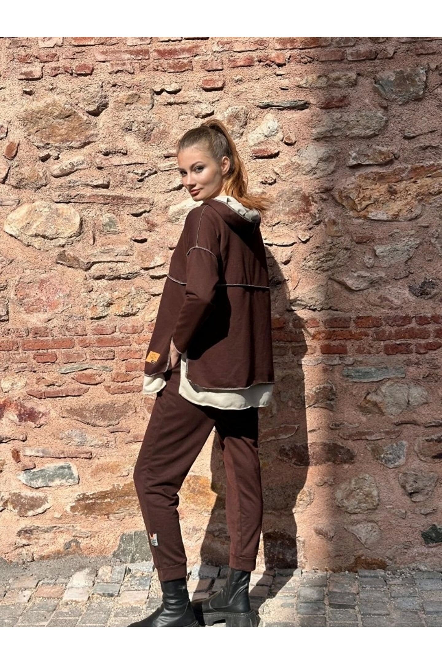 Kadın Kahve Kapşonlu Etek Ucu Detay Arma Ters Dikiş Gorunumlu Ikili Takım