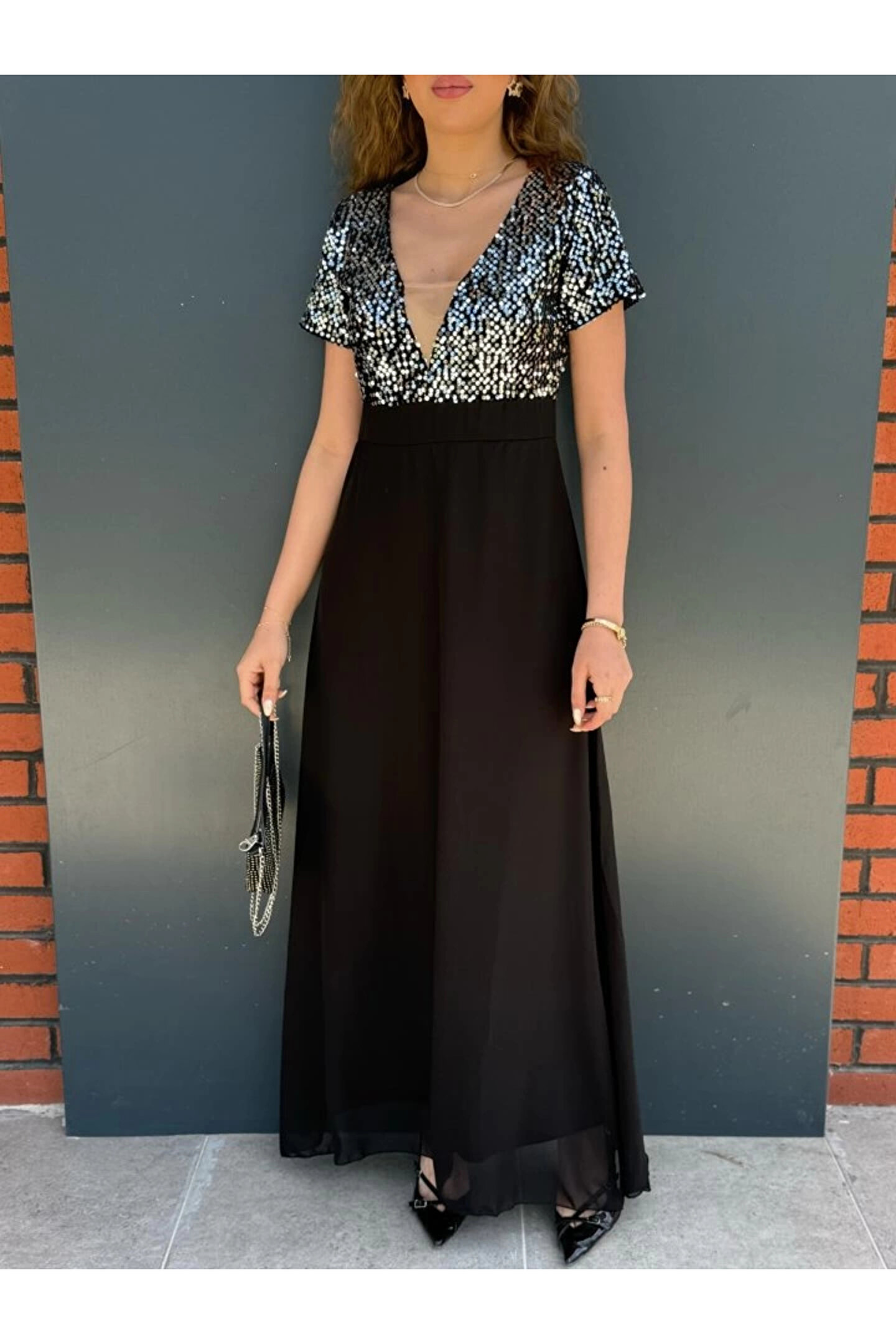 Kadın Kısa Kollu Derin V Yakalı A Kesim Pulpayet Detaylı şifon Nedime Elbisesi