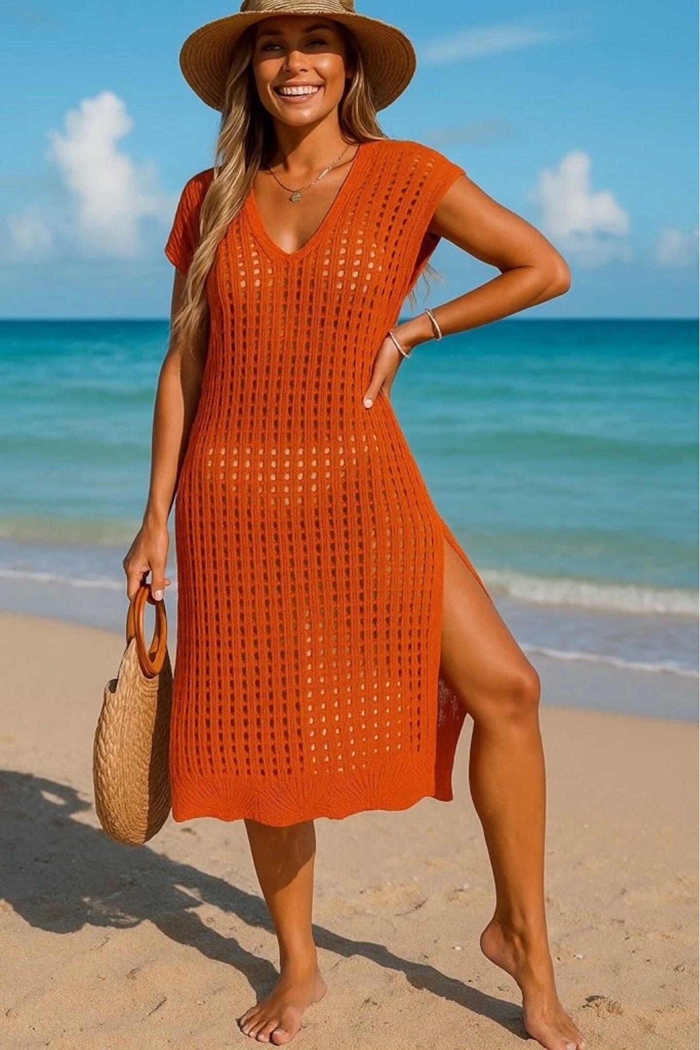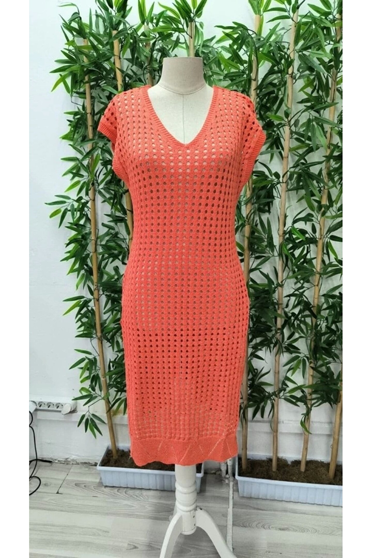 Kadın Sıfır Kol V Yaka Yanı Derin Yırtmaçlı Midi Boy Triko Elbise