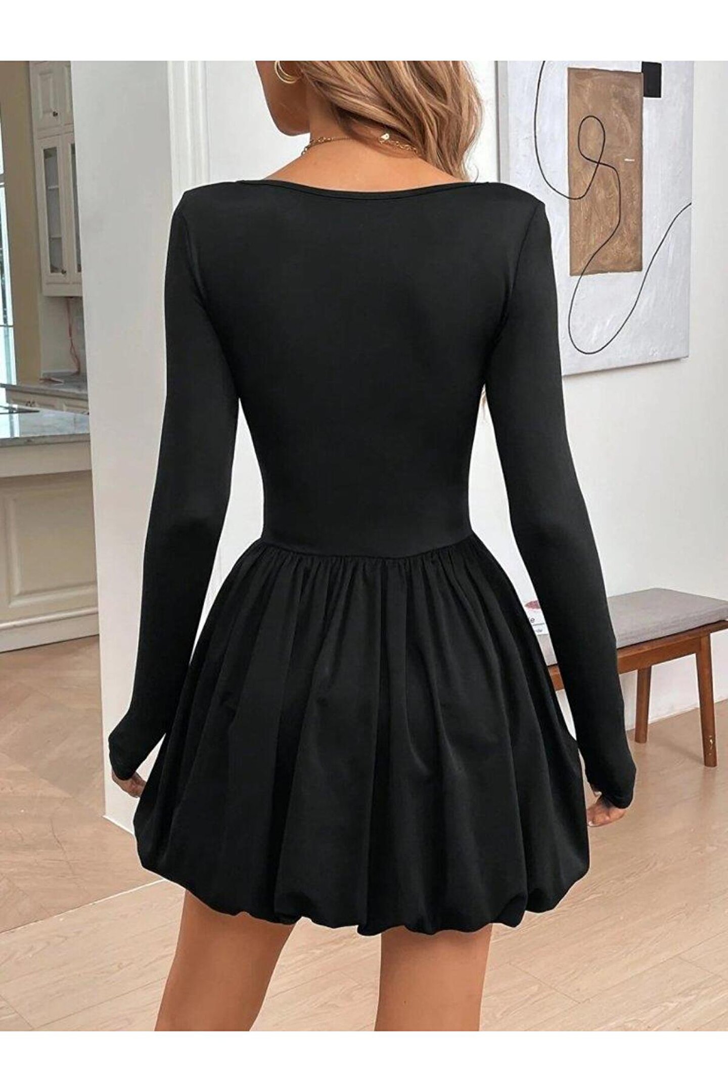 Kadın Uzun Kollu Kare Yaka Mini Balon Modal Elbise
