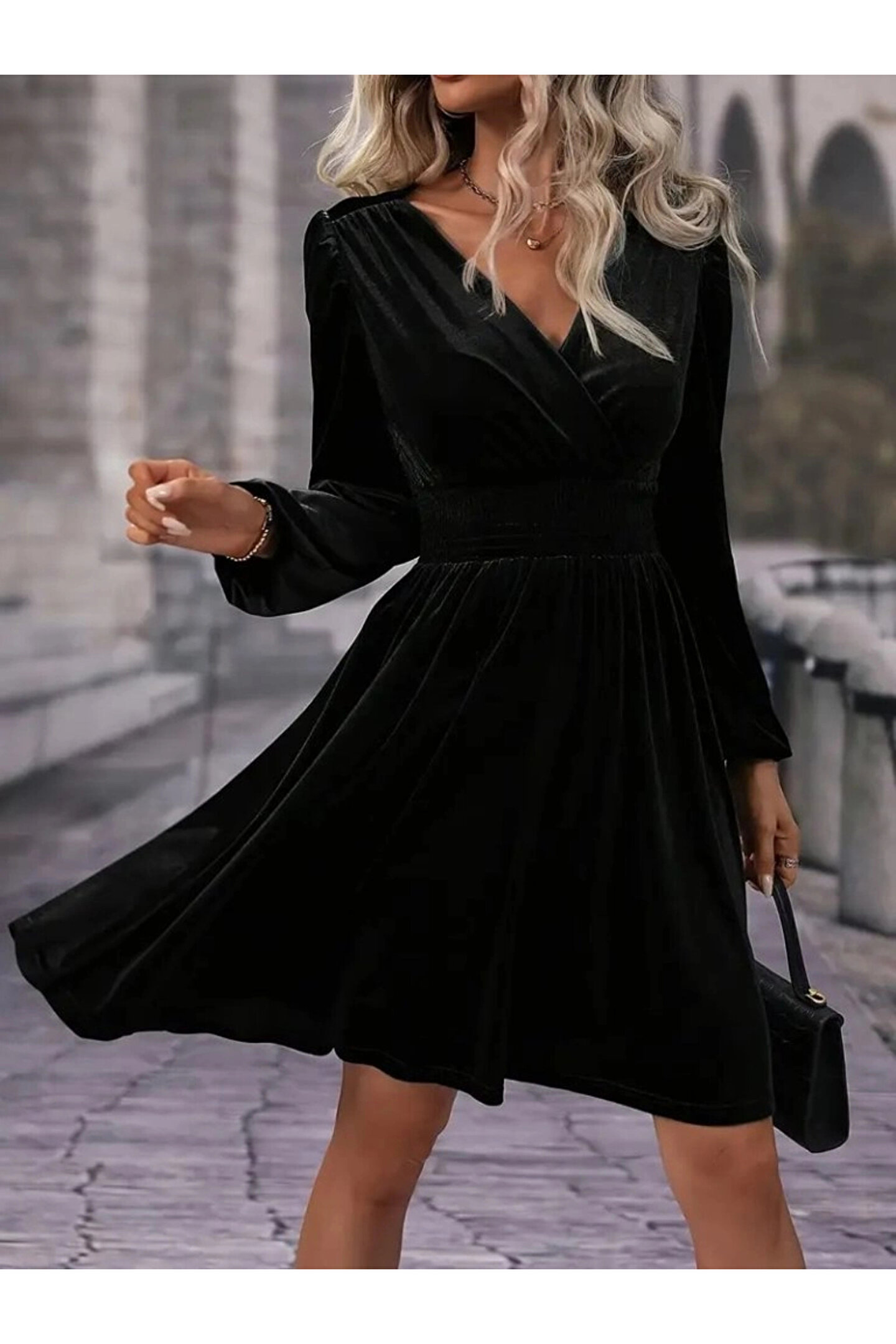Kadın Uzun Kollu Kruvaze Yaka Beli Lastikli Kiloş Kadife Elbise