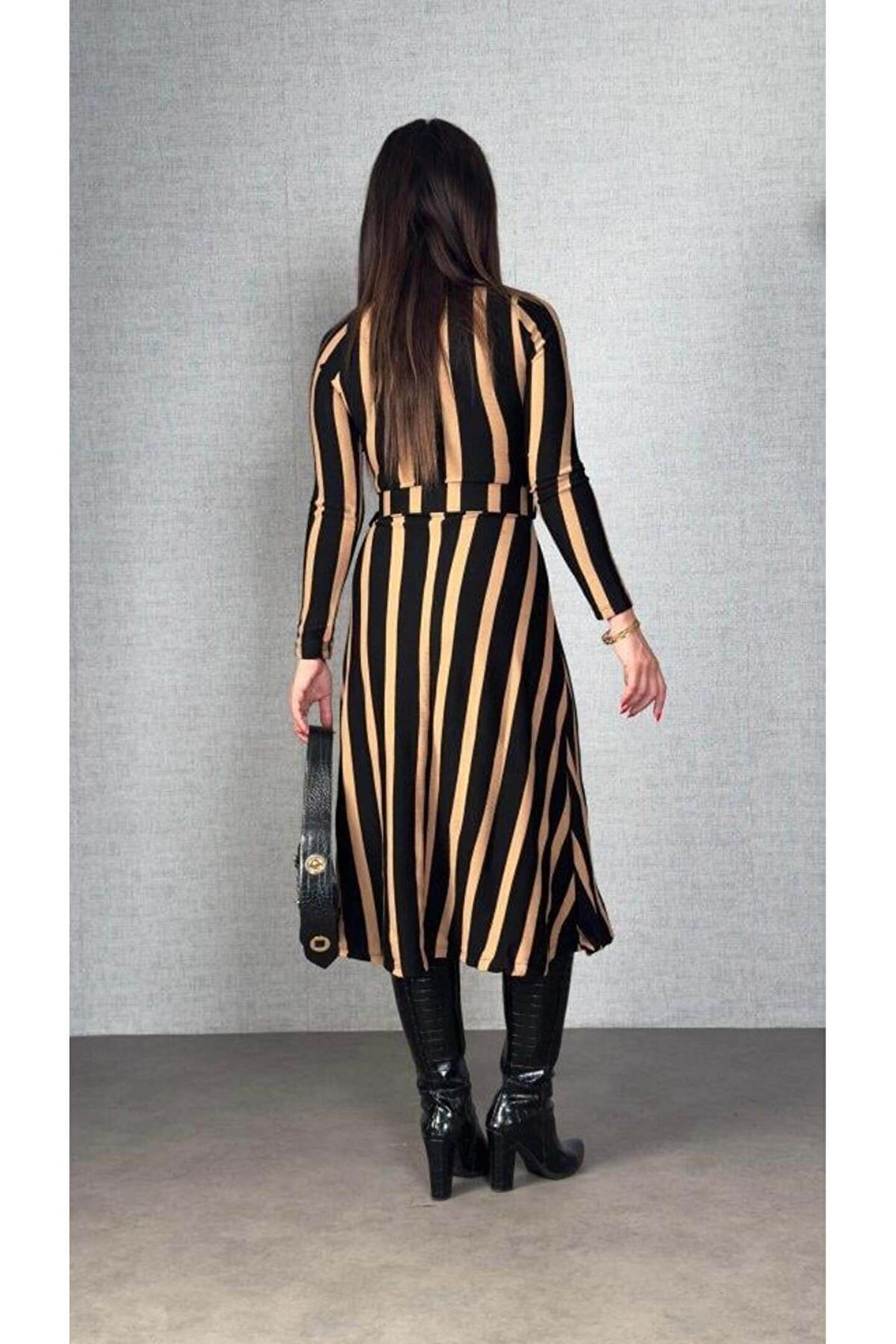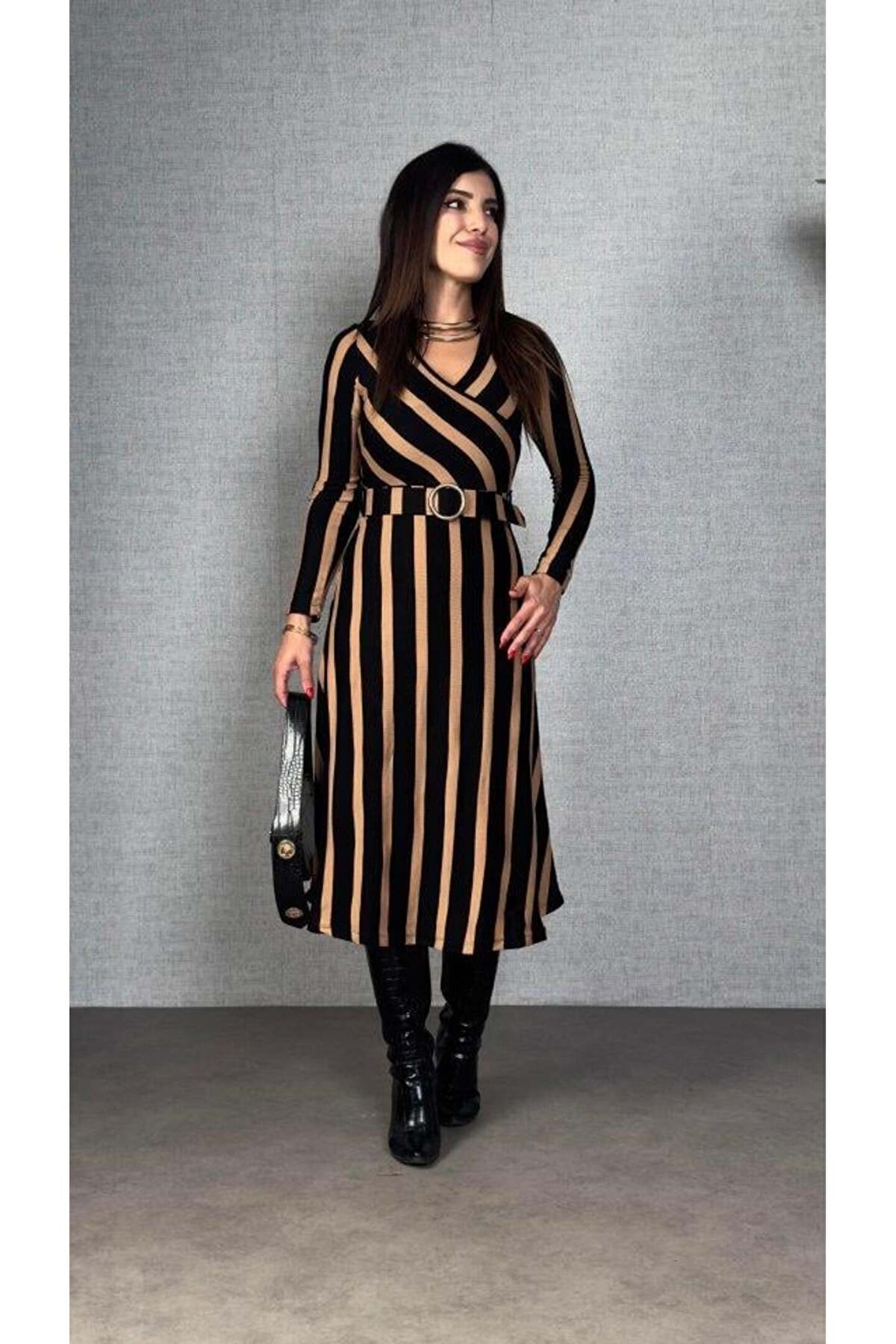 trend_ermege Kadın Uzun Kollu Kruvaze Yaka Kemer Dahil çizgili Triko Elbise