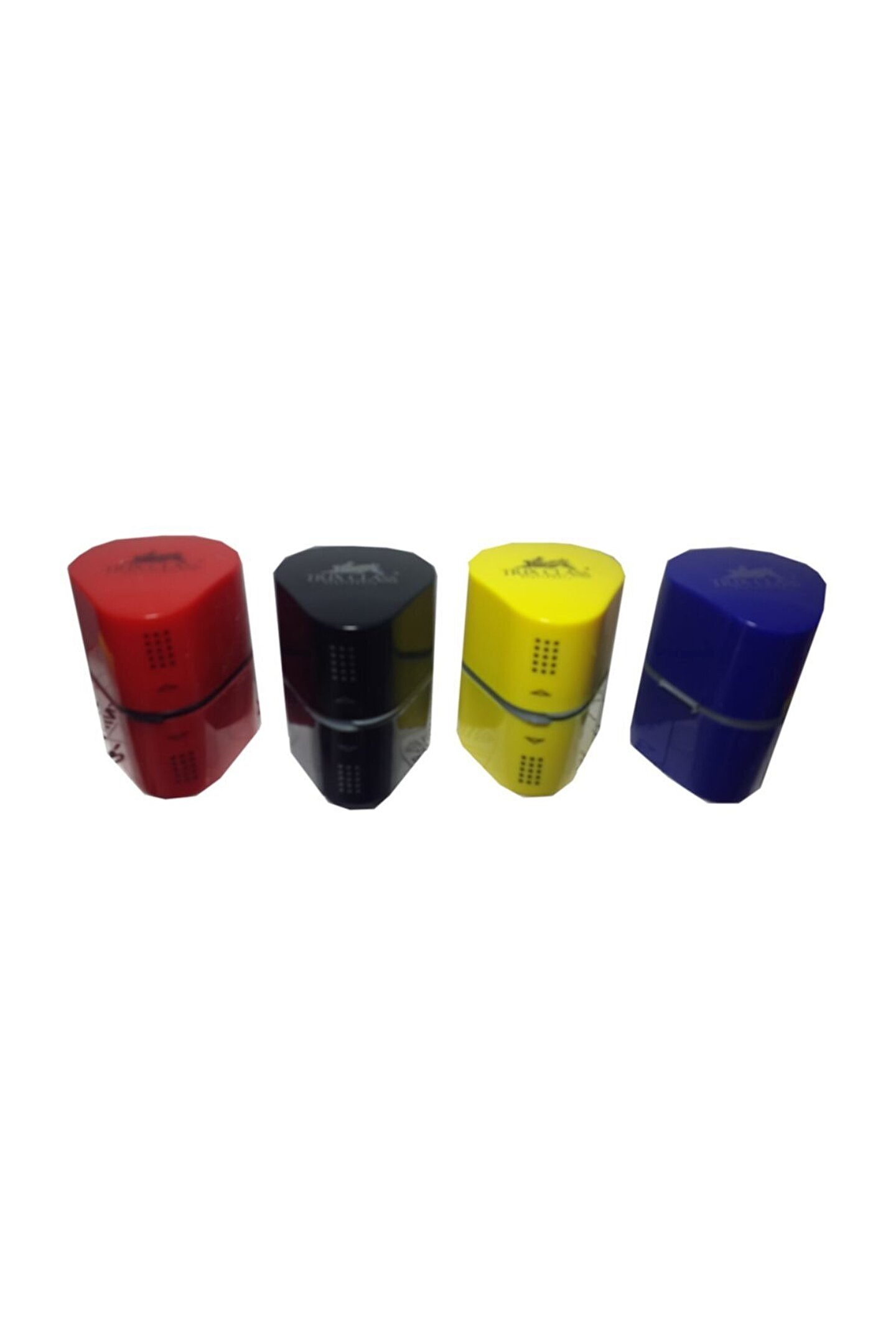 2 hazne içinde standart tekli ve farklı kalemleri de açabilecek 2'li kalemtraş yuvası bulunan çok özellikli bir kalemtraş; 4 adet birden;