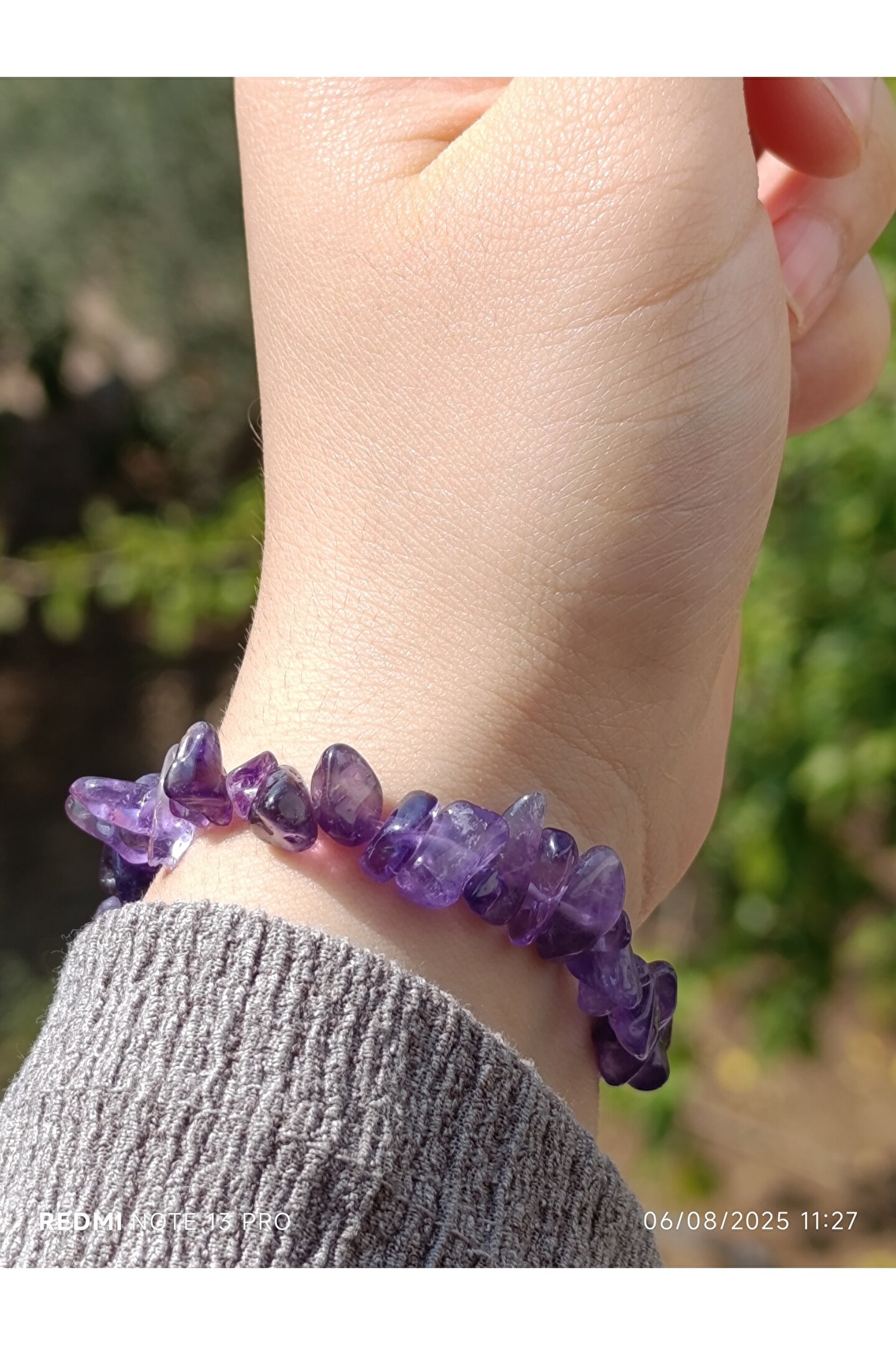 * Doğanın Mor Büyüsü: Bu bileklik, ametist taşının doğal ve büyüleyici mor tonlarını en saf haliyle yansıtır.; Her bir parça, doğanın binlerce yılda oluşturduğu benzersiz kırık taşlardan oluşur ve bilekliğe özgün bir karakter katar.; * Negatif Enerjilere Kalkan: Ametist taşı, tarih boyunca ruhsal dengeleyici ve koruyucu bir taş olarak bilinir.; Bu bileklik, etrafınızdaki negatif enerjileri uzaklaştırmaya yardımcı olurken, size pozitif bir ortam sunar.; * Zihinsel Berraklık ve Huzur: Yoğun geçen bir günün ardından zihninizi sakinleştirmek ve odaklanmanızı artırmak için ametist taşının yatıştırıcı gücünden faydalanabilirsiniz.; Bilekliği taktığınızda, huzurlu ve dingin bir his elde etmenize yardımcı olur.; * El Yapımı ve Eşsiz: Her bir bileklik, ametist kırık taşlarının özenle bir araya getirilmesiyle el yapımı olarak üretilir.; Bu nedenle, bilekliğiniz tamamen benzersizdir ve başka bir benzeri yoktur.; * Rahat ve Şık Tasarım: Esnek misina ipi sayesinde her bileğe kolayca uyum sağlar.; Şık ve sade tasarımıyla hem günlük kombinlerinize hem de özel anlarınıza eşlik edebilir.; * Anlamlı ve Özel Bir Hediye: Sevdiklerinize huzur, denge ve pozitif enerji dolu bir hediye vermek isterseniz, bu ametist bileklik mükemmel bir seçenektir.; Onlara doğanın şifalı gücünü hediye edin.