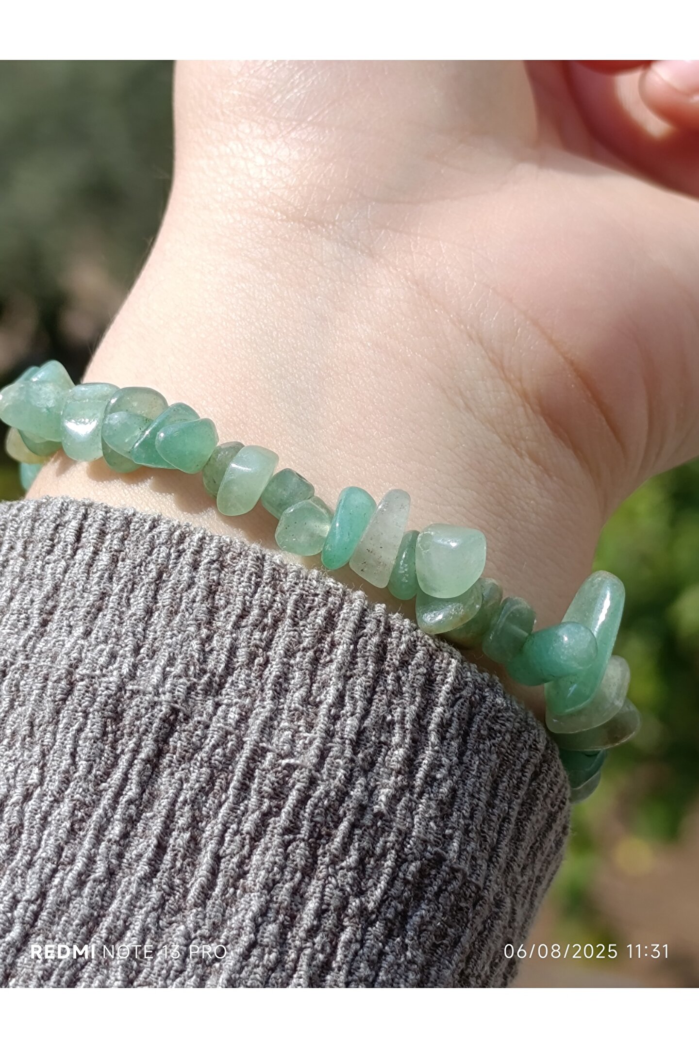 * Malzeme: %100 doğal, kırık aventurin taşları kullanılarak el yapımıdır.; Her bir bileklik, taşların eşsiz ve doğal formu sayesinde benzersizdir.; * Özellikleri: Aventurin, şans ve bolluk taşı olarak bilinir.; Kullanıcısına pozitif enerji, iç huzur ve duygusal denge getirdiğine inanılır.; Kalp çakrası ile uyumlu çalışarak sevgi, affetme ve şefkat duygularını güçlendirebilir.; * Tasarım: Estetik ve sade bir tasarıma sahiptir.; Bileklik, ayarlanabilir yapısı sayesinde her bilek ölçüsüne rahatlıkla uyar ve günlük kullanıma uygundur.; Kırık taşların doğal ve rustik görünümü, ürüne otantik bir hava katar.; * Kullanım: Hem kadınlar hem de erkekler için idealdir.; Günlük kıyafetlerinizle kolayca kombinleyebileceğiniz gibi, özel anlarda da enerjisiyle size eşlik edebilir.; Sevdikleriniz için anlamlı ve özel bir hediye seçeneğidir.; * Bakım: Doğal taşların enerjisini temizlemek için ayda bir kez adaçayı tütsüsüyle arındırabilir veya akan su altında kısa bir süre bekletebilirsiniz.; Kimyasal maddelerden ve aşırı sıcaklıktan uzak tutulması tavsiye edilir