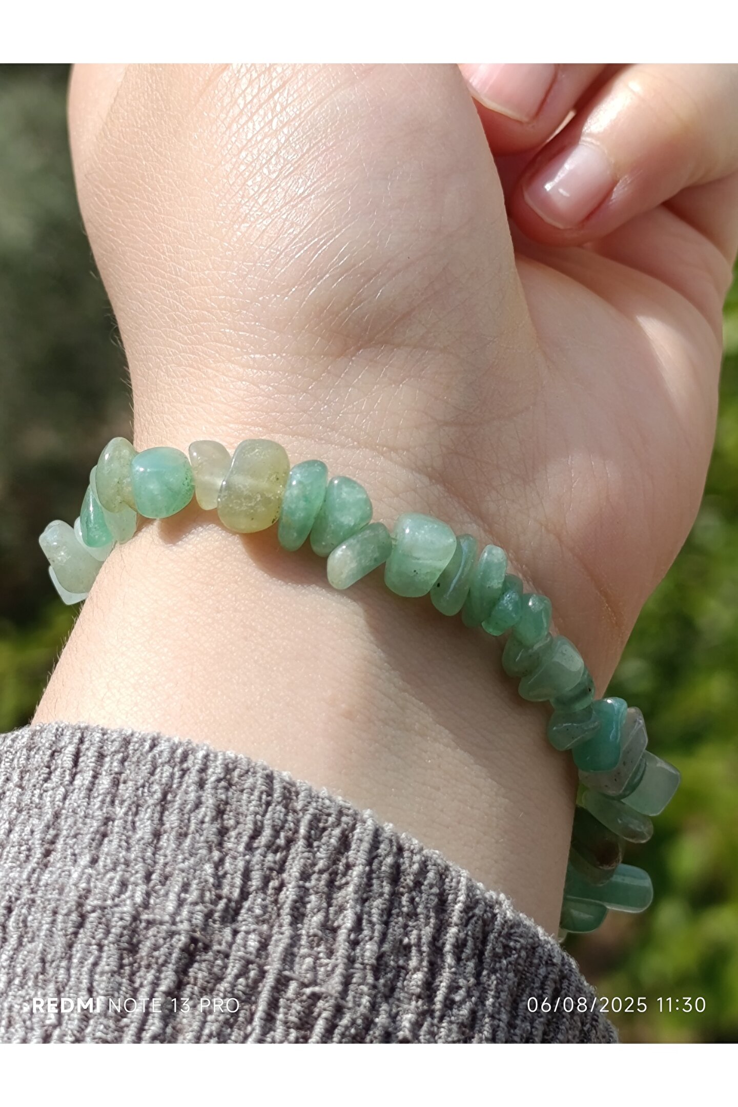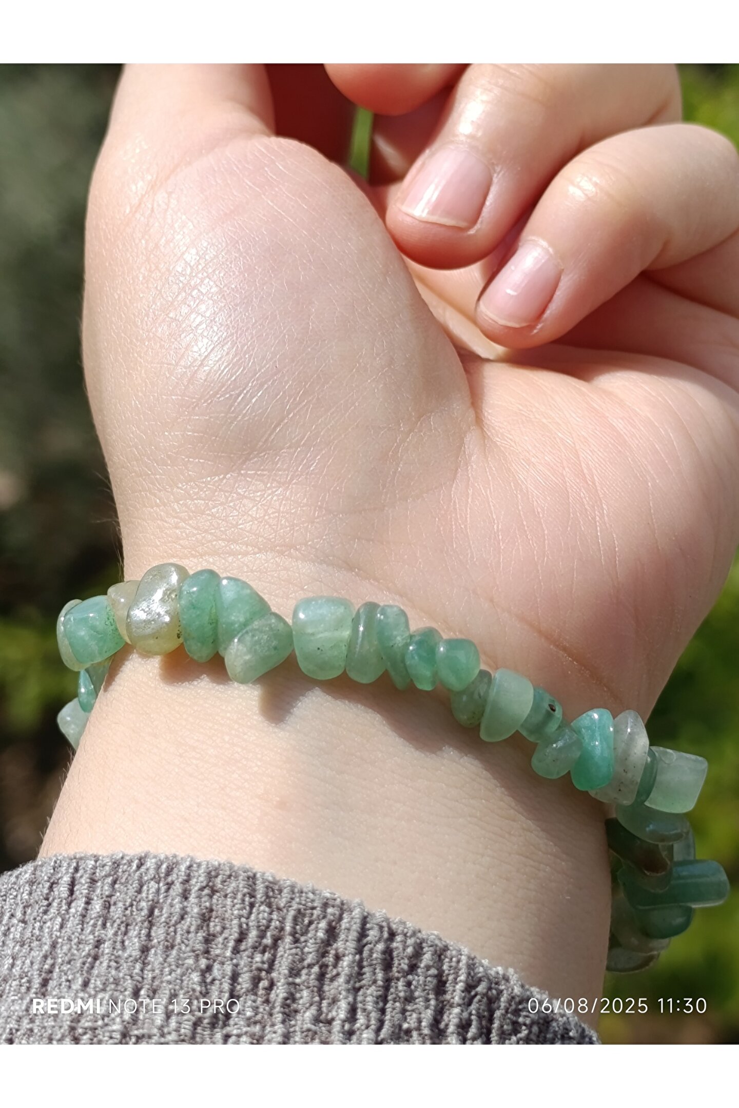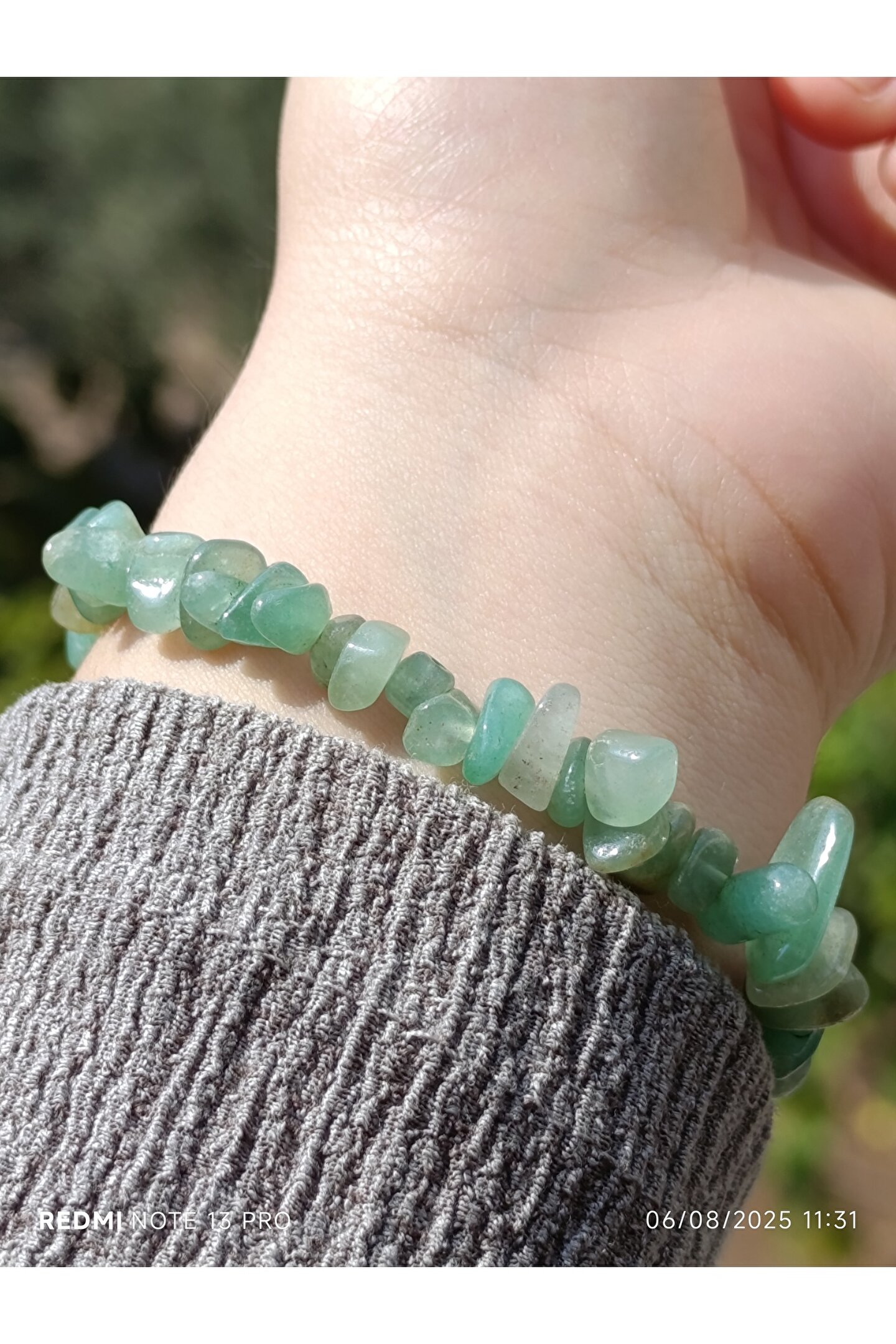 * Malzeme: %100 doğal, kırık aventurin taşları kullanılarak el yapımıdır.; Her bir bileklik, taşların eşsiz ve doğal formu sayesinde benzersizdir.; * Özellikleri: Aventurin, şans ve bolluk taşı olarak bilinir.; Kullanıcısına pozitif enerji, iç huzur ve duygusal denge getirdiğine inanılır.; Kalp çakrası ile uyumlu çalışarak sevgi, affetme ve şefkat duygularını güçlendirebilir.; * Tasarım: Estetik ve sade bir tasarıma sahiptir.; Bileklik, ayarlanabilir yapısı sayesinde her bilek ölçüsüne rahatlıkla uyar ve günlük kullanıma uygundur.; Kırık taşların doğal ve rustik görünümü, ürüne otantik bir hava katar.; * Kullanım: Hem kadınlar hem de erkekler için idealdir.; Günlük kıyafetlerinizle kolayca kombinleyebileceğiniz gibi, özel anlarda da enerjisiyle size eşlik edebilir.; Sevdikleriniz için anlamlı ve özel bir hediye seçeneğidir.; * Bakım: Doğal taşların enerjisini temizlemek için ayda bir kez adaçayı tütsüsüyle arındırabilir veya akan su altında kısa bir süre bekletebilirsiniz.; Kimyasal maddelerden ve aşırı sıcaklıktan uzak tutulması tavsiye edilir