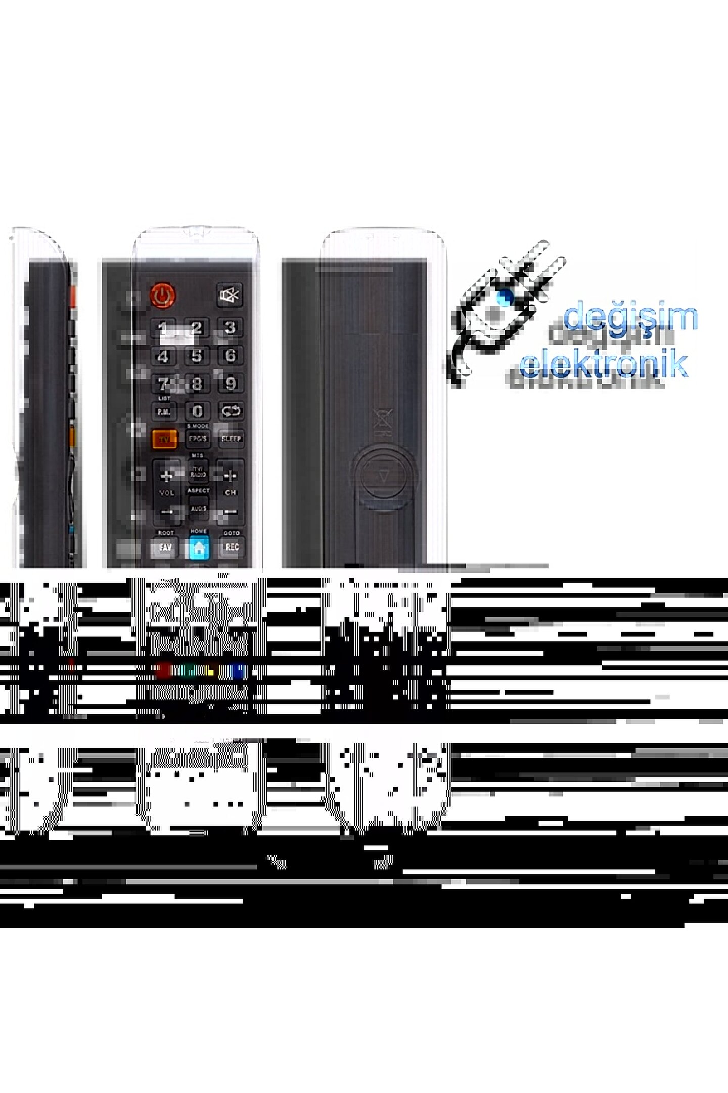 Kumanda siparişi verirken kumandanızla görseldeki ürünün tuşlarının birebir uymasına dikkat ediniz. ; Ürünlerimiz kontrol edilerek gönderilir 1.KALİTE YAN SANAYİ ÜRÜNDÜR GÖNDERİLECEK ÜRÜN GÖRSEL İLE BİREBİR AYNISIDIR. ; TTEKNOLOJİK (DEĞİŞİM ELEKTRONİK-SAMSUN);