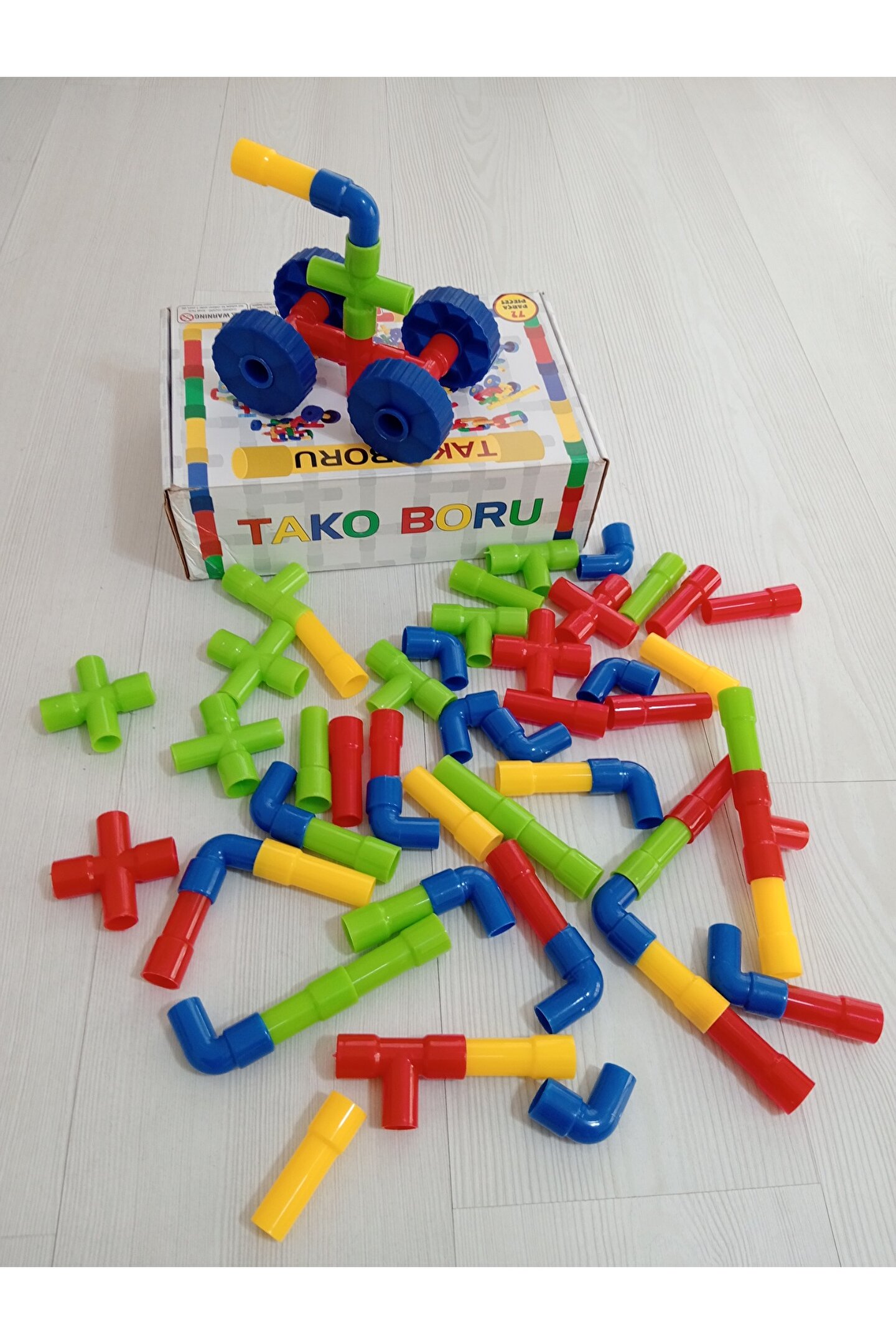 TAKO BORU OYUNU 72 PARÇATako Boru Oyunu, 3 yaş ve üzeri çocuklar için uygun bir üründür ve 72 parçadan oluşmaktadır. İçeriğinde 4 farklı renk ve 4 farklı şekilde tasarlanmış parçalar bulunur. Bu borular, birbirine geçebilir ve çocuklar tarafından binlerce farklı şekilde birleştirilerek kullanılabilir.Oyun setinin içinde yer alan tekerlekler, çocuklara farklı yapılar oluşturma ve tasarım yapma konusunda özgürlük sunar. Bu sayede çocuklar, hayal güçlerini kullanarak kendi yaratıcı projelerini geliştirebilirler. Tako Boru Oyunu, çocukların el becerilerini, problem çözme yeteneklerini ve yaratıcılıklarını desteklemek amacıyla tasarlanmış eğlenceli bir oyundur.Ayrıca, oyunun parçalarının renk ve şekil çeşitliliği, çocukların görsel algılarını ve renk eşleştirme yeteneklerini geliştirmelerine katkı sağlar. Tako Boru Oyunu, çocukların motor becerilerini, el-göz koordinasyonunu ve mantıksal düşünme yeteneklerini güçlendirmeyi amaçlayan interaktif bir oyun deneyimi sunar.Bu eğlenceli ve eğitici oyunda, çocuklar hem bir araya getirdikleri parçalarla yeni nesneler oluşturabilir hem de oyun sırasında problem çözme yeteneklerini geliştirirken keyifli vakit geçirebilirler. Tako Boru Oyunu, çocukların öğrenmeyi keşfetmeleri ve kendi yaratıcılıklarını sergilemeleri için bir platform sunar.Paket İçeriği1 kutu tako boru oyunu 72 parça