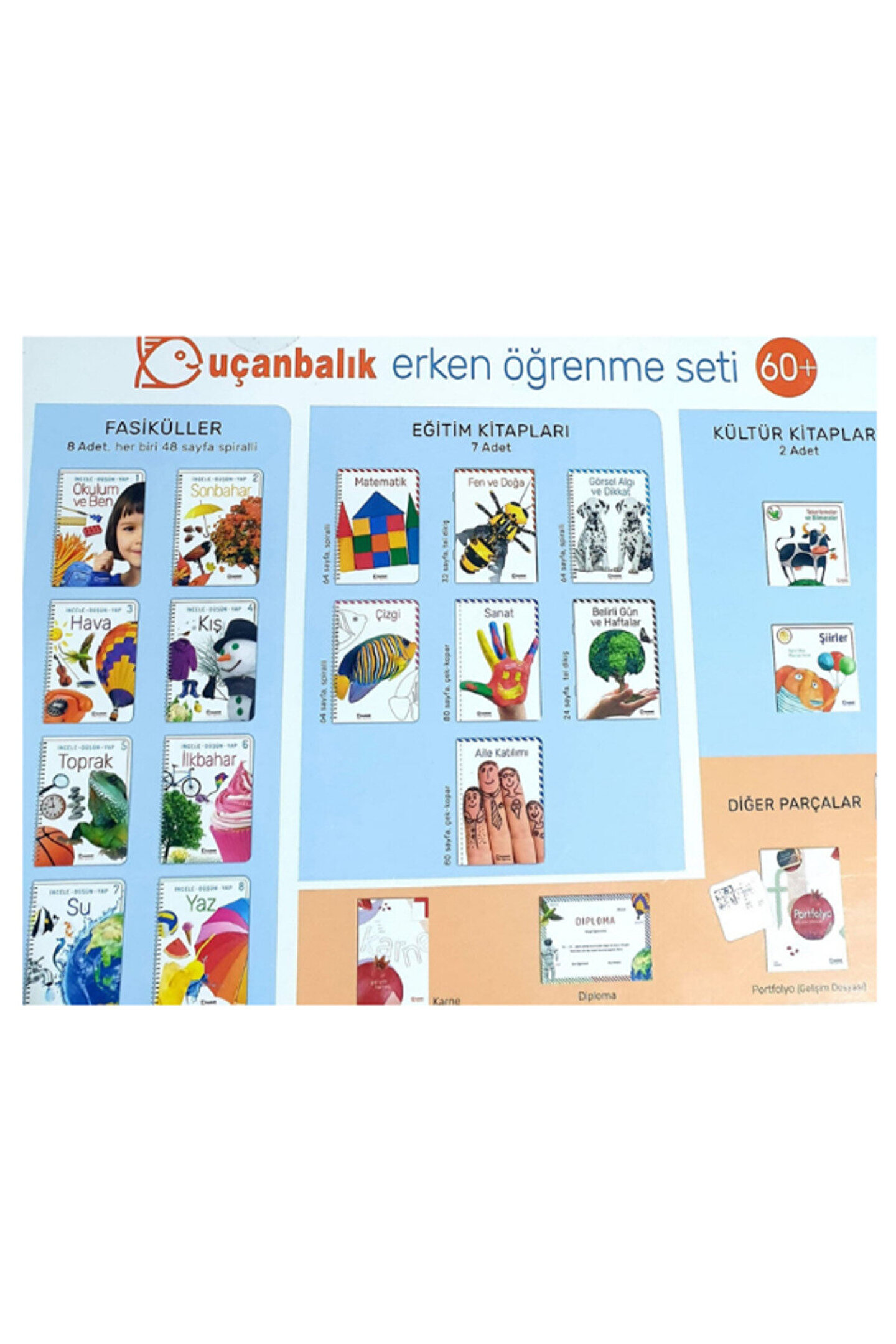 Uçanbalık 60+ erken öğrenme seti, zekâ gelişiminin yüzde 90’ının gerçekleştiği 0-6 yaş arası dönemdeki öğrenme sürecinin en sağlıklı ve verimli şekilde gerçekleşmesi için hazırlandı. ; Kutu içinde 8 adet fasikül (okulum ve ben, sonbahar, hava, kış, toprak, ilkbahar, su, yaz), 7 adet eğitim kitabı (matematik, fen ve doğa, görsel algı ve dikkat, çizgi, sanat, belirli gün ve haftalar, aile katılımı) ve 2 adet kültür kitabının (tekerlemeler ve bilmeceler, şiirler) yanı sıra karne, diploma ile portfolyo bulunuyor. ; Erken öğrenme seti’nde meb programının yanı sıra, dünyada başarısını kanıtlamış reggio emilia, pyp ve “beyne dayalı öğrenme” gibi yaklaşımlar esas alındı. ; Set, çocukların doğasında var olan merak ve sorgulama isteklerini bir plan içinde harekete geçirerek becerilerini üst düzey kullanmaya yönlendirmeyi hedefliyor.;