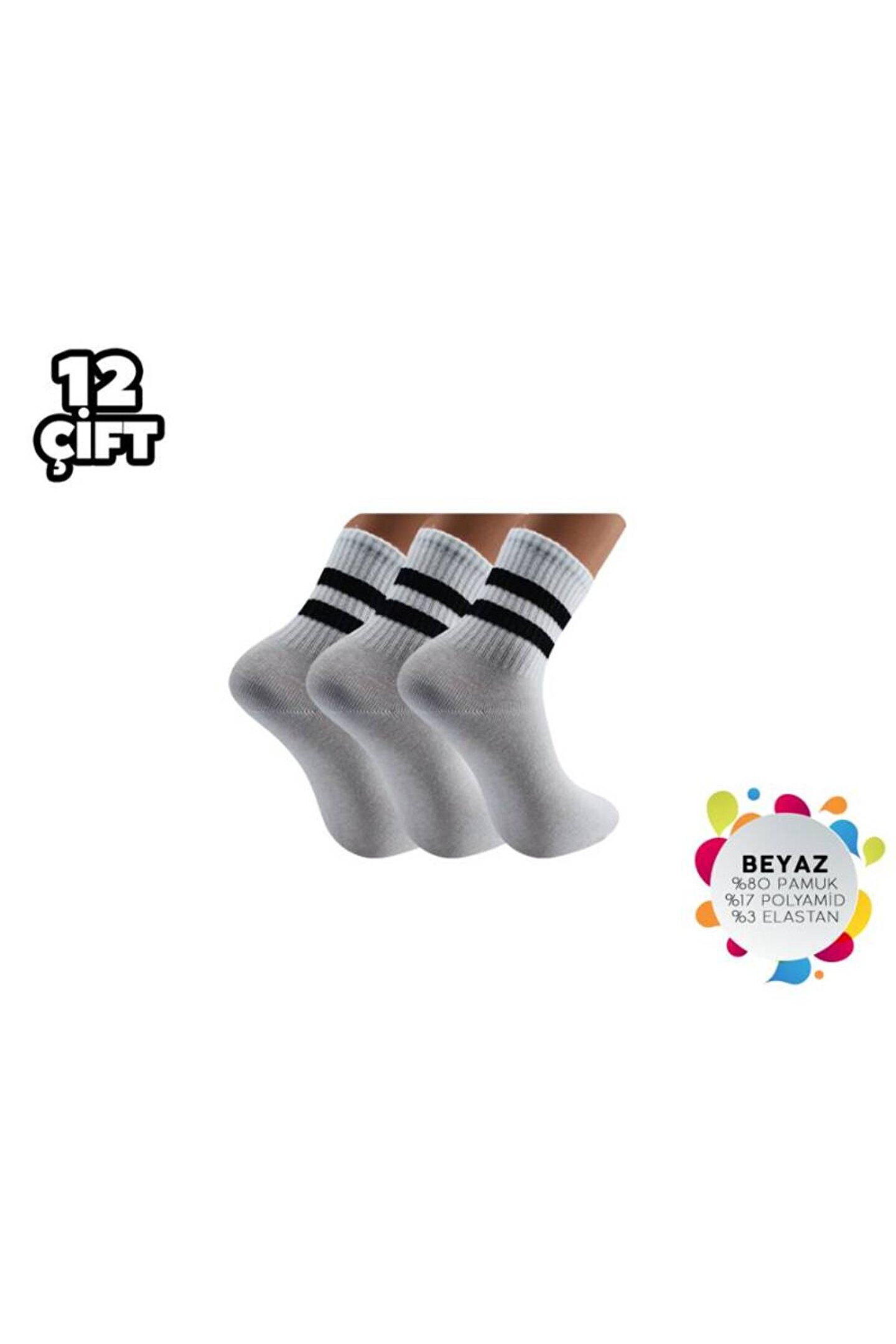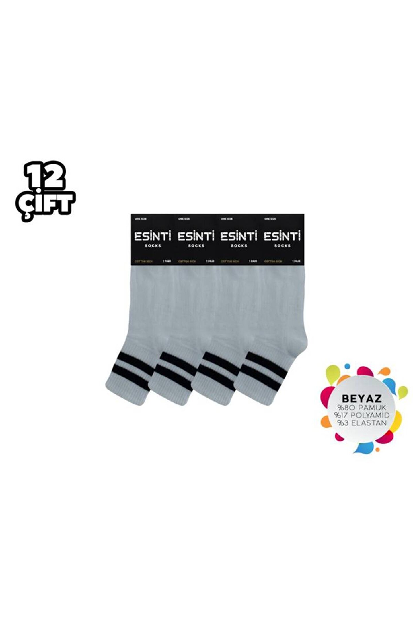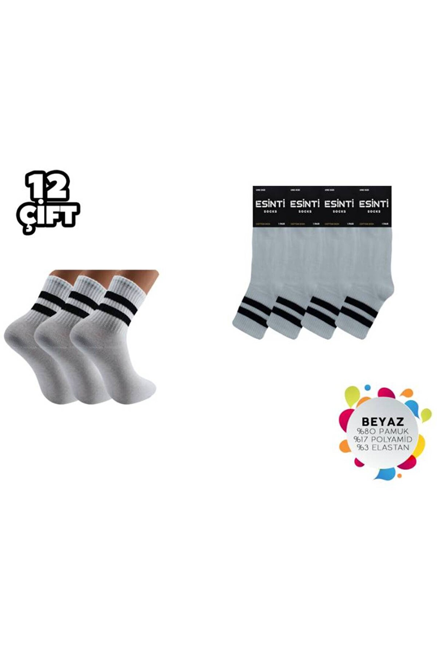 - Esinti Beyaz Çemberli Kolej Çorap, günlük kullanım için ideal, rahat ve şık bir seçimdir.; - Dokuma kumaş yapısı sayesinde dayanıklılığı artırılmıştır ve uzun süreli kullanımlarda bile formunu korur.; - Kadın ve kız kullanıcılar için tasarlanmış olup, her yaş grubuna hitap eder.; - Regular boy kesimi ile ayaklarınızın doğal şeklini desteklerken konforlu bir deneyim sunar.; - 12'li paketiyle ekonomik bir alternatif olarak gardırobunuzda yerini alır.; - Geometrik deseniyle modern ve dinamik bir görünüm kazandırırken, beyaz rengi kolay kombin yapma imkanı sağlar.; - İpliği boyalı teknolojiye sahip olması, renklerin canlılığını uzun süre muhafaza etmesine yardımcı olur.; - Homewear ortamları için uygundur; evdeki rahatlığınızdan ödün vermeden stilinizi korumanızı sağlar.; - Web color özelliği ile internetten kolayca temin edilebilen bu çoraplar, beyaz renk seçeneğiyle zarifliği ön plana çıkartır.; - Soket tipi tasarım, bacaklarınızın estetiğini bozmadan tam koruma sağlar.; - Elastan materyali esneklik katarken hareket özgürlüğünüzden ödün vermezsiniz.; - Yıkama talimatlarına uygun bakım yapıldığında ürün ömrü uzar ve ilk günkü kalitesini korur.; - Sürdürülebilirlik detayına dikkat edilmemiştir ancak üretim sürecinde çevreye duyarlı yaklaşımlar benimsenmiştir.; - Uzun silueti sayesinde ayağın tüm yüzeyini sararak maksimum konfor sunar.; - 36 - 40 beden arası geniş beden skalasıyla herkes için uygunluk gösterir.