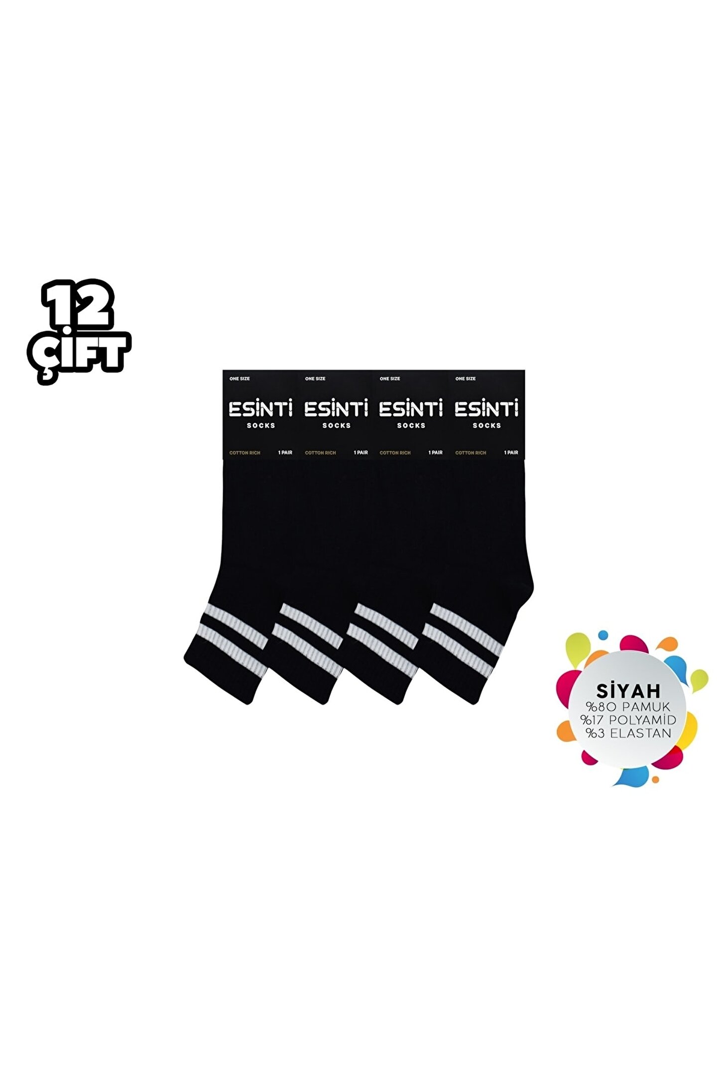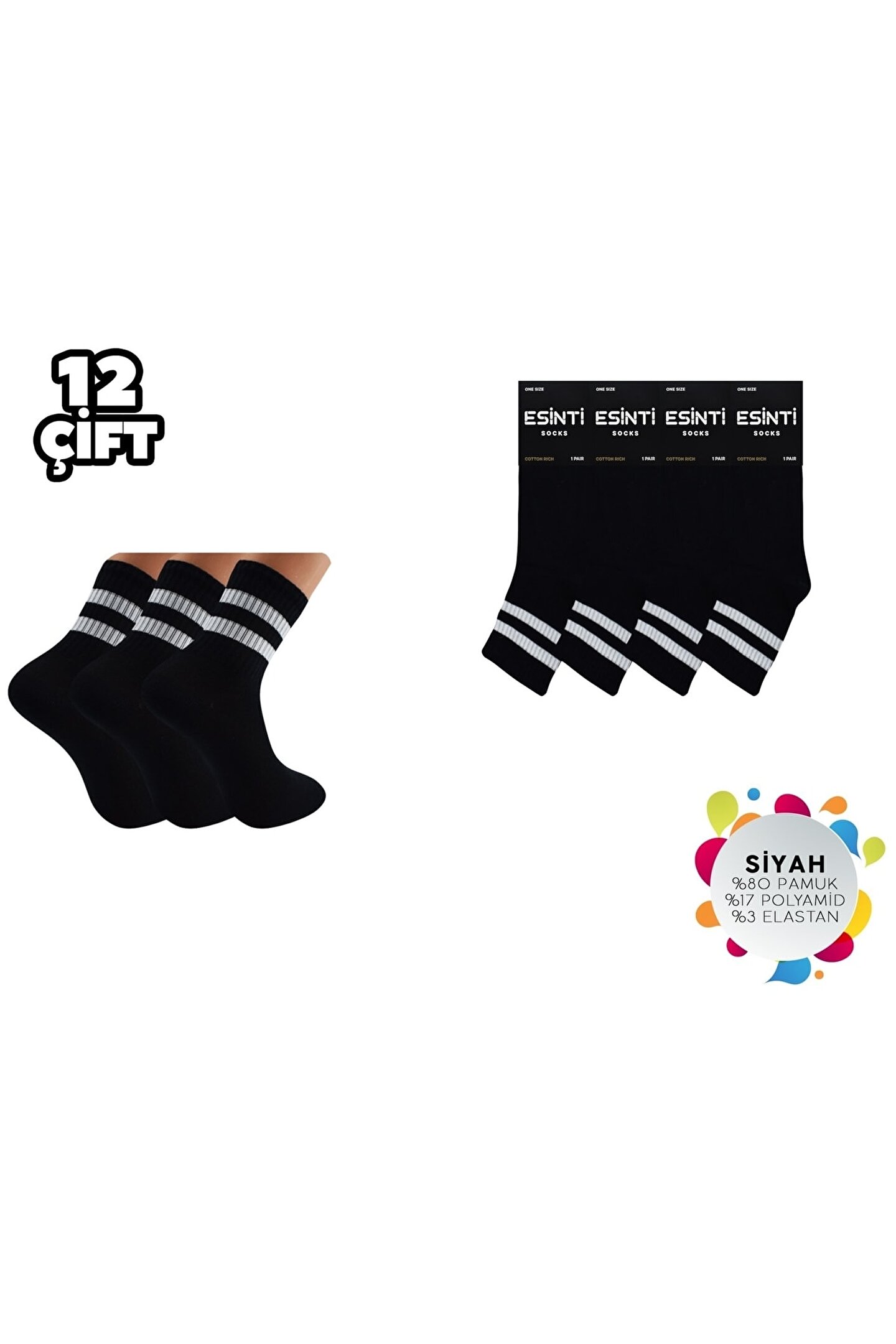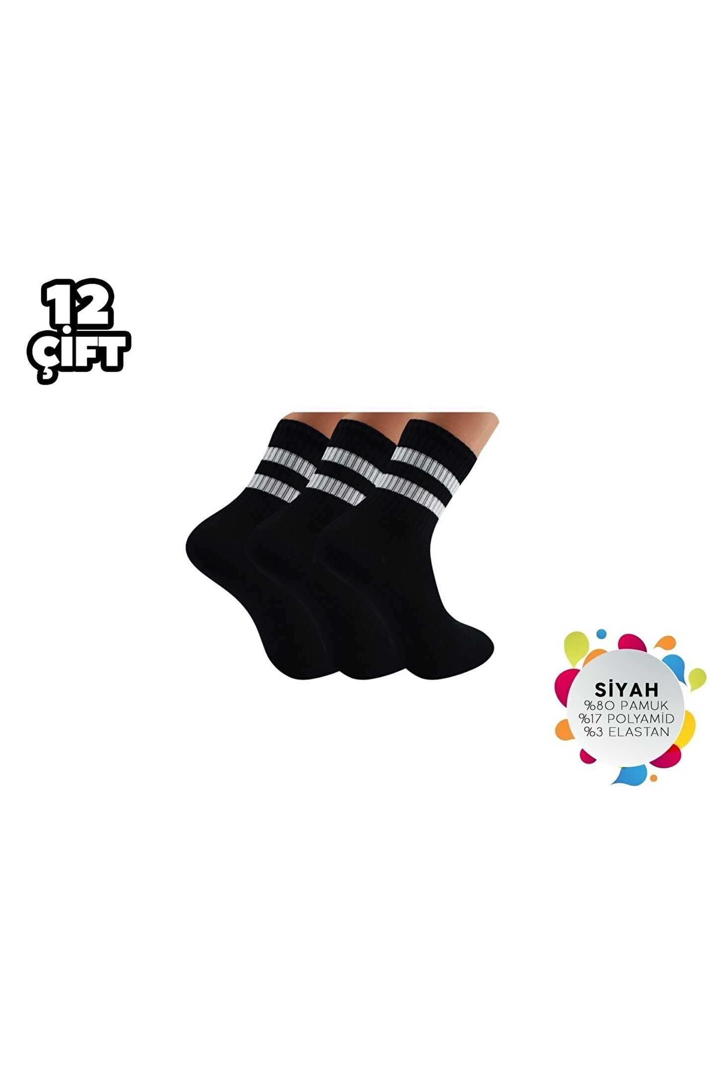 - Esinti Siyah Çemberli Kadın Kolej Çorap, günlük kullanım için ideal, rahat ve şık bir seçenektir.; - Dokuma kumaş tipi sayesinde dayanıklı ve uzun ömürlü bir kullanım sunar.; - Kadın ve kız kullanıcılar için tasarlanmış olup, her yaş grubuna hitap eder.; - Mix nakış tekniği ile detaylandırılmış desenleriyle göz alıcı bir görünüm sağlar.; - Cool & comfort persona'ya sahip olan bu çoraplar, konforlu ve stil sahibi kombinlerin vazgeçilmezi olacak.; - Regular boy kesimi ile farklı ayak tiplerine uyum sağlar ve rahat bir oturuş sunar.; - 12'li paketi sayesinde uzun süreli ihtiyaçlarınızı karşılar ve ekonomik bir seçenek oluşturur.; - Geometrik desenleriyle modern ve dinamik bir tarz yaratmanıza olanak tanır.; - Tüm sezonlarda tercih edebileceğiniz bu çoraplar, mevsimsellikten bağımsızdır.; - Görsel renk tonlarıyla dikkat çekici bir etki bırakırken, ipliği boyalı yapısıyla kaliteyi hissettirir.; - Lastik detayı sayesinde kolayca giyilip çıkartılabilir ve ayakkabınıza mükemmel uyum sağlar.; - Casual/günlük ortamlarda rahatlıkla tercih edebileceğiniz esinti kolej çoraplar, her türlü kombininize eşlik eder.; - Siyah rengi ile kolayca kombinleyebileceğiniz bu çoraplar, zamansız bir şıklık sunar.; - Havlu dokuma tipi yumuşak dokusuyla ayaklarınızın nefes almasına yardımcı olurken konforlu bir deneyim yaşatır.; - Casual/günlük ortamlarda rahatlıkla tercih edebileceğiniz esinti kolej çoraplar, her türlü kombininize eşlik eder.