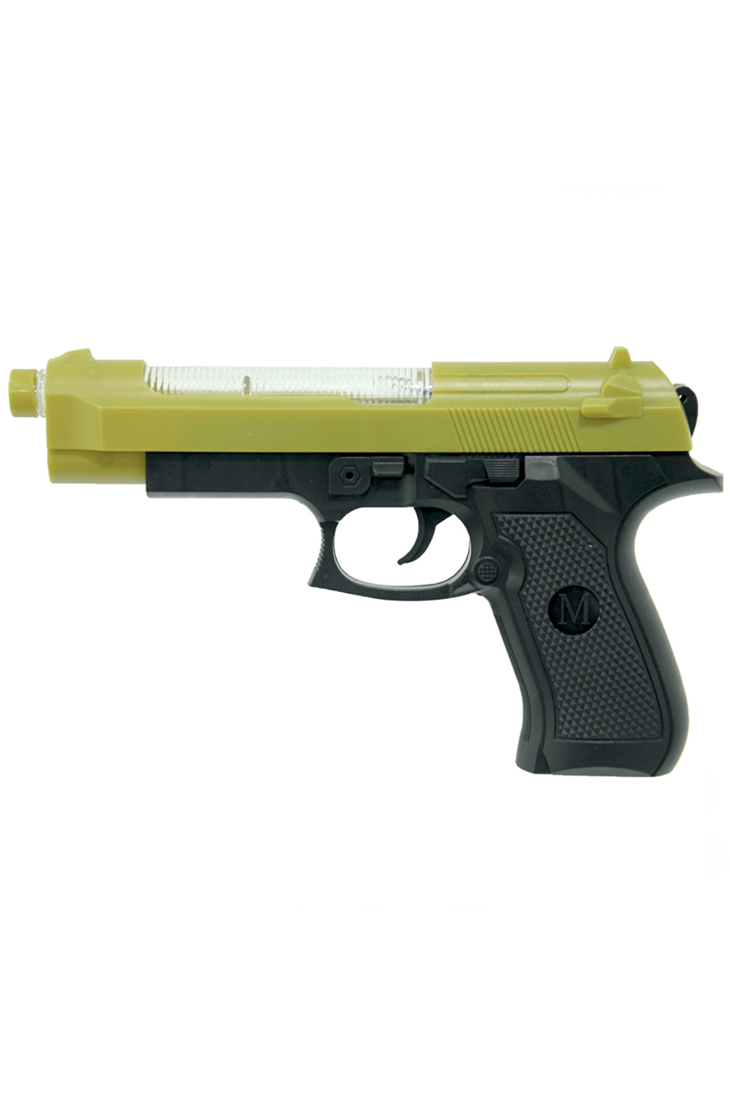By a.; D.; M sesli ışıklı lazerli oyuncak silah pilli tabanca Sesli ve ışıklı pilli tabanca.; ; Namlu üzerinde ışıklar yanar ve namlu ileri geri hareket eder.; ; Tabanca boyu : 20,3 cm.; ; Sesi ve renkli görünümü ile çocuklar oynamaya doyamayacak.; ; Ürün 3 adet aa 1,5v pil ile çalışır.; (piller dahil değildir.; ) Ürün poşet içerisinde satılmaktadır.; ; Önemli not: Ürünün 2 farklı rengi vardır.; ; fiyat tek bir ürünün fiyatıdır.; ; Ürün rengi stok durumuna göre gönderilecektir.; ; Yaş grubu : 3+ yaş Kutu ölçüleri : 21,5 x 13,5 x 4 cm.;