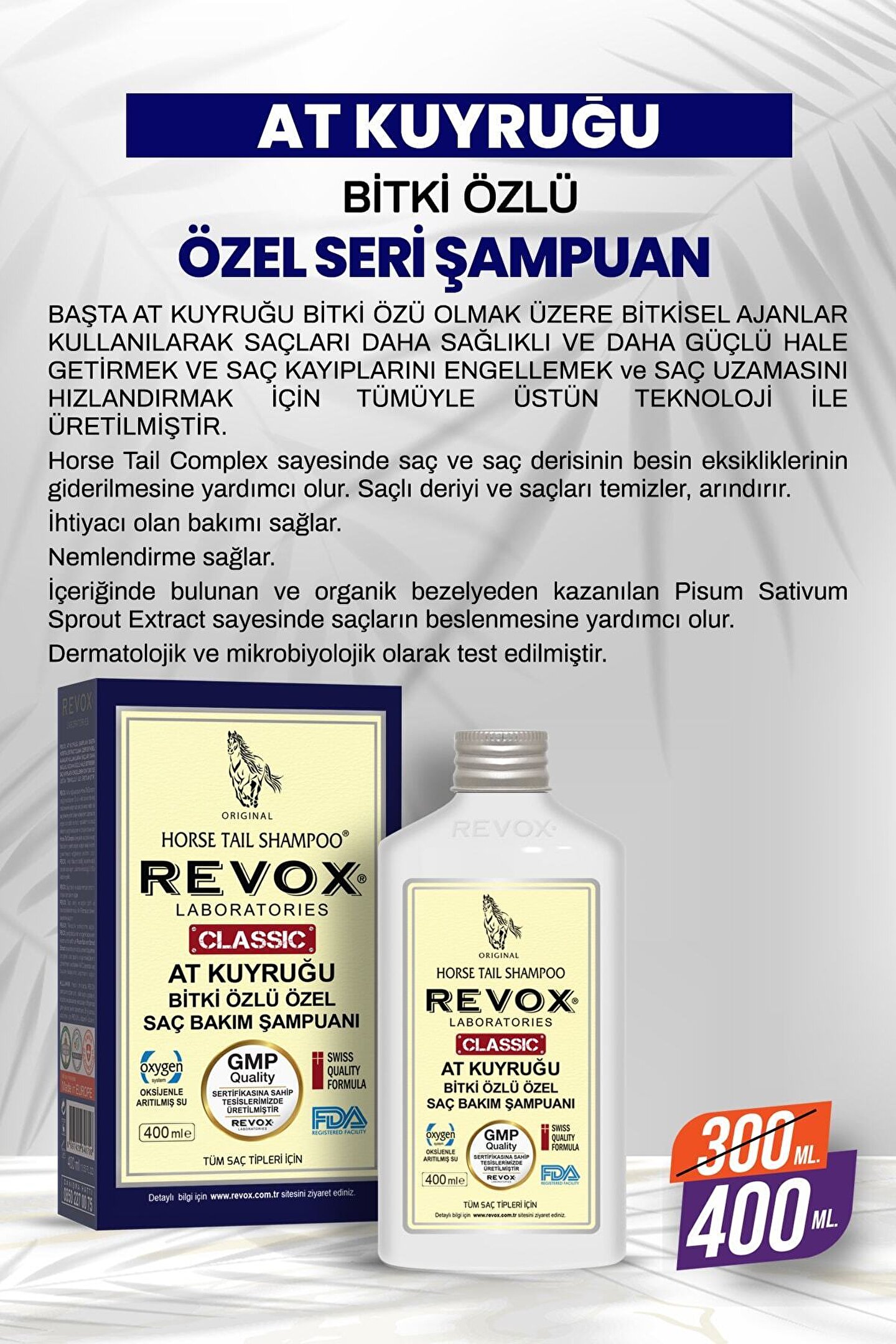 Mağaza: TuffY'S - - At Kuyruğu Bitki Özlü Şampuan, önleyerek hızlı uzama sağlar, sağlıklı ve güçlü saçlara kavuşmanıza yardımcı olur.; - 400 ml hacmindeki formülü, 18’den fazla bitki özü ile zenginleştirilmiş olup, saç derisini besleyerek oksijen alımını artırır.; - Tüm saç tipleri için uygun olan bu şampuan, yağlanmayı geciktirir, dolgunluk ve hacim kazandırarak sağlıklı bir görünüm sunar.; - TuffY'S güvencesiyle sunulan REVOX At Kuyruğu Şampuanı, müşteri memnuniyetini öncelik olarak benimseyerek güvenli bir alışveriş deneyimi sağlar.