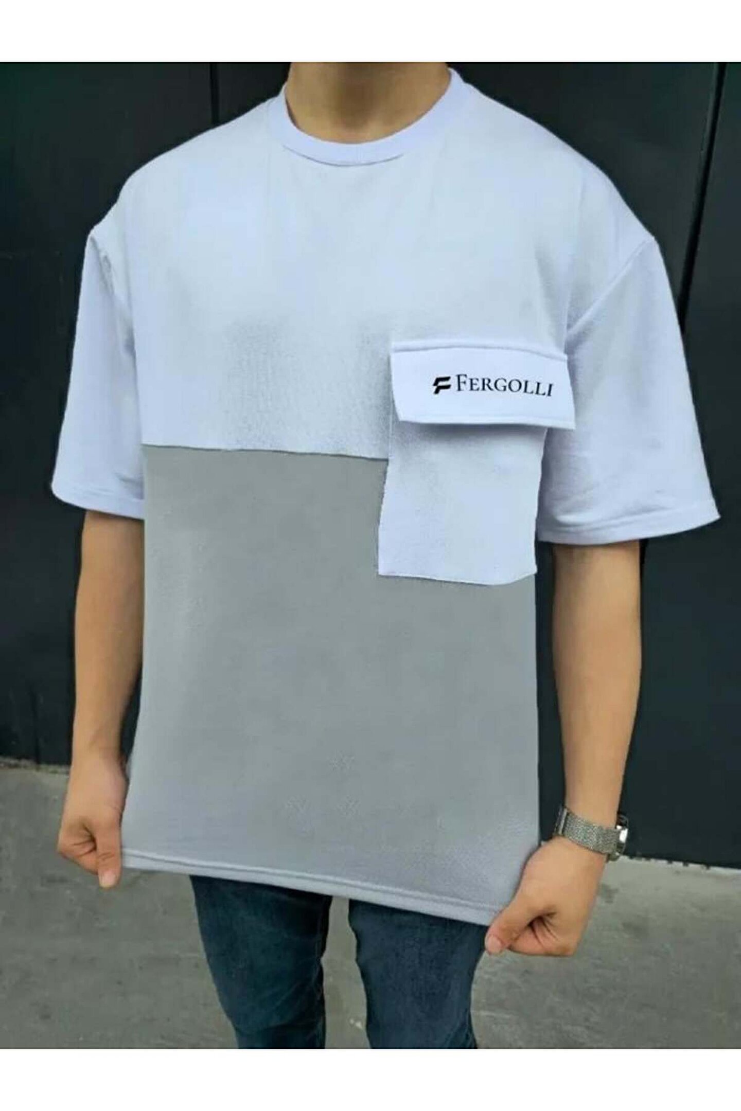 Unisex Torba Cep Detaylı Parçalı T-Shirt - Gri