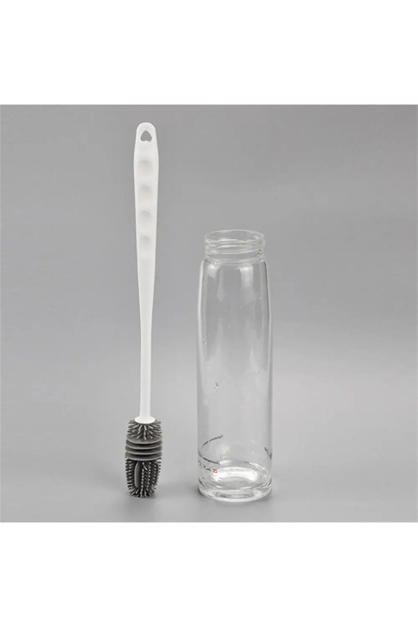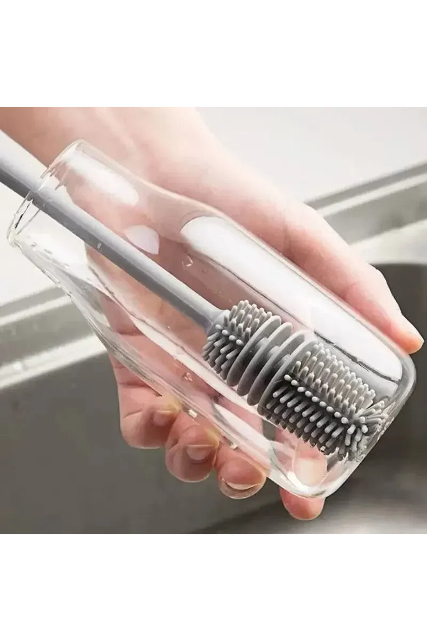 Uzun saplı, silikon tasarıma sahip, zararlı kimyasallar içermeyen silikon fırça ; kalıntıları gidererek uygun şekilde temizlemek için şişelerin her köşesine ulaşacak şekilde tasarlanmıştır.