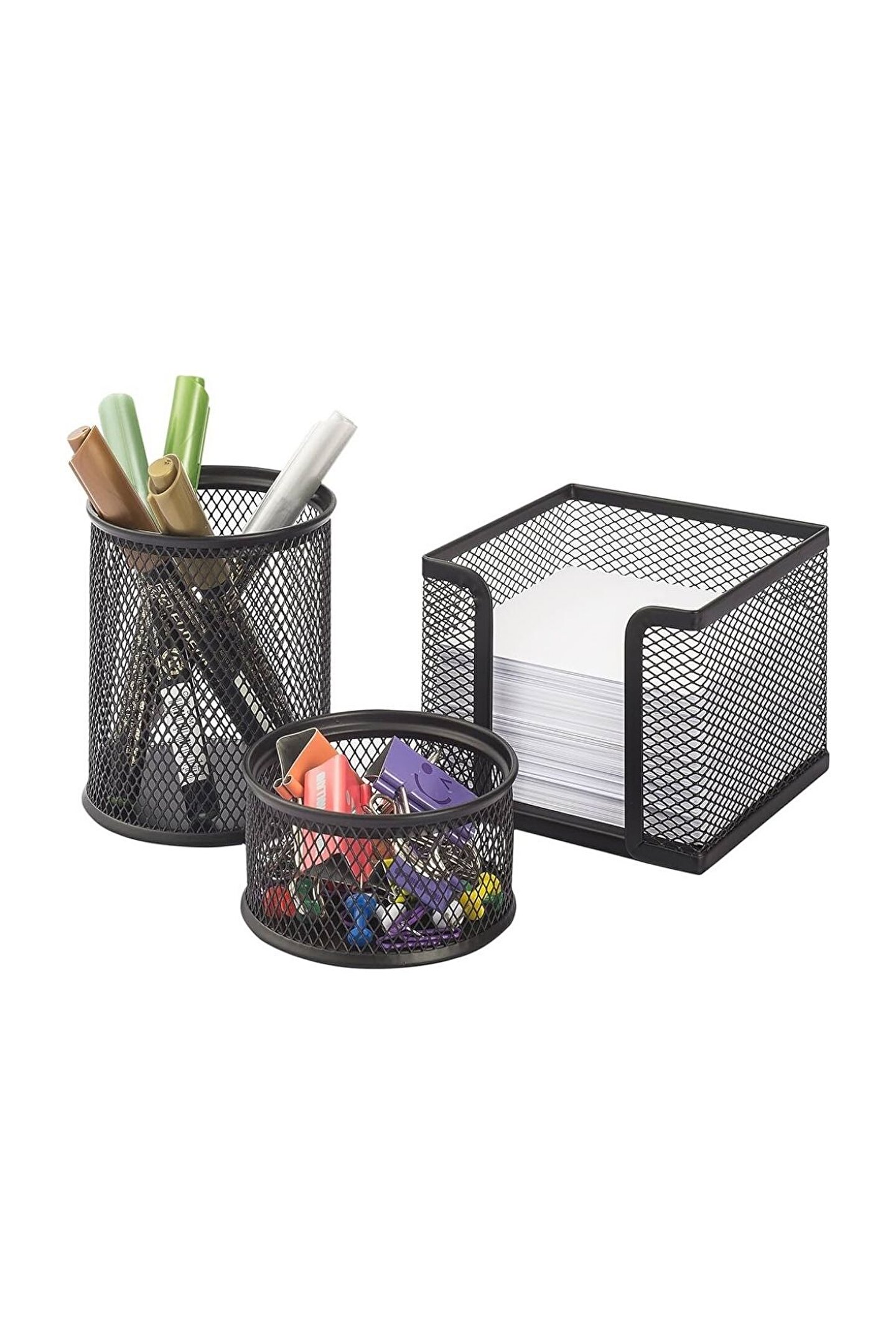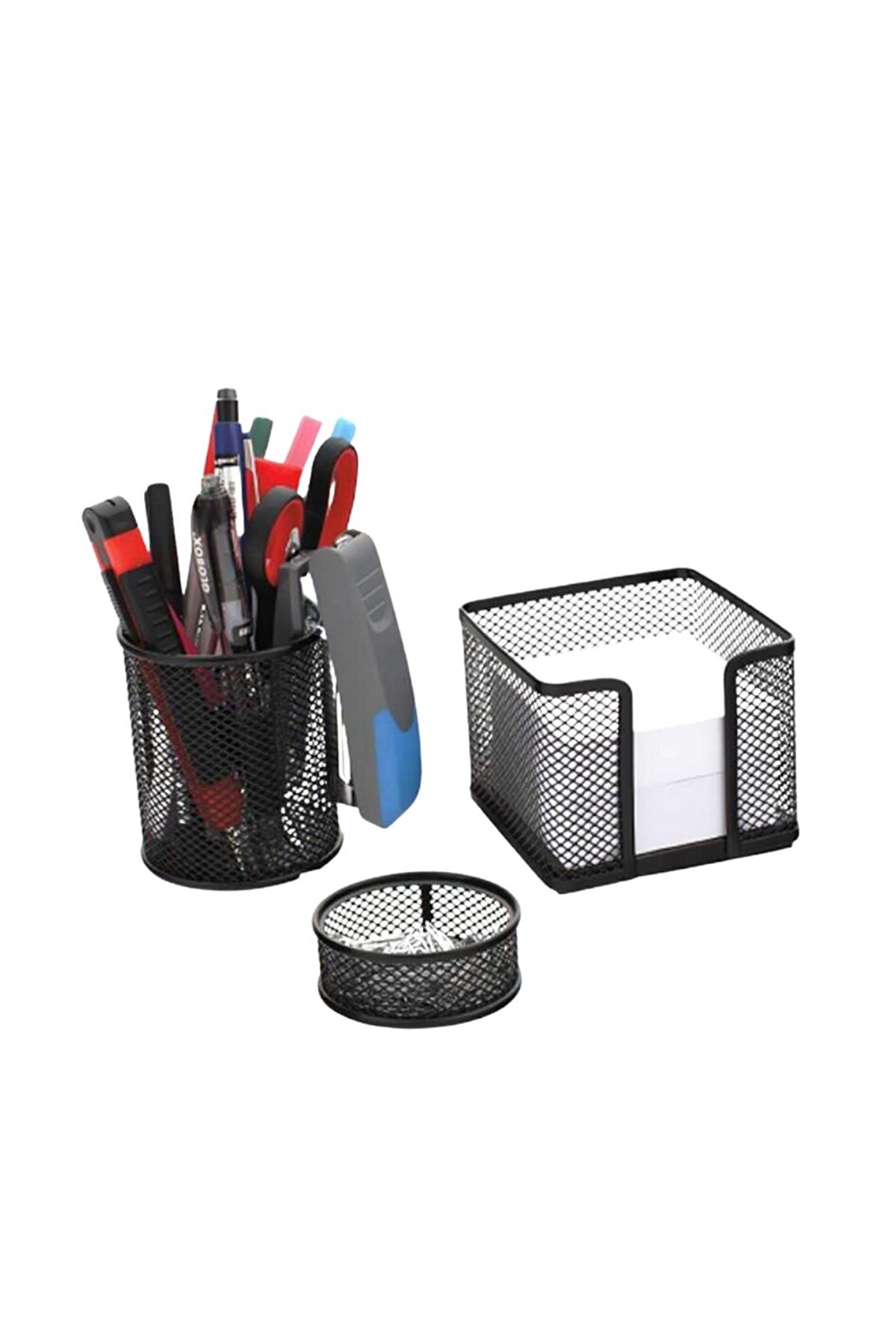 Dayanıklı metal malzeme kullanımı, uzun ömürlü ve sağlam bir kullanım sunar; Siyah renk seçeneği ile modern ve şık bir görünüm sağlar, çalışma alanınıza estetik bir dokunuş katar; Üç parçadan oluşan set, kalemlik, ataşlık ve tel masa düzenleyiciyi içerir; böylece tüm yazı gereçlerinizi düzenli bir şekilde saklamanızı kolaylaştırır; Metal malzeme sayesinde çizilmelere ve darbelere karşı dayanıklıdır, günlük kullanımda bile formunu korur;