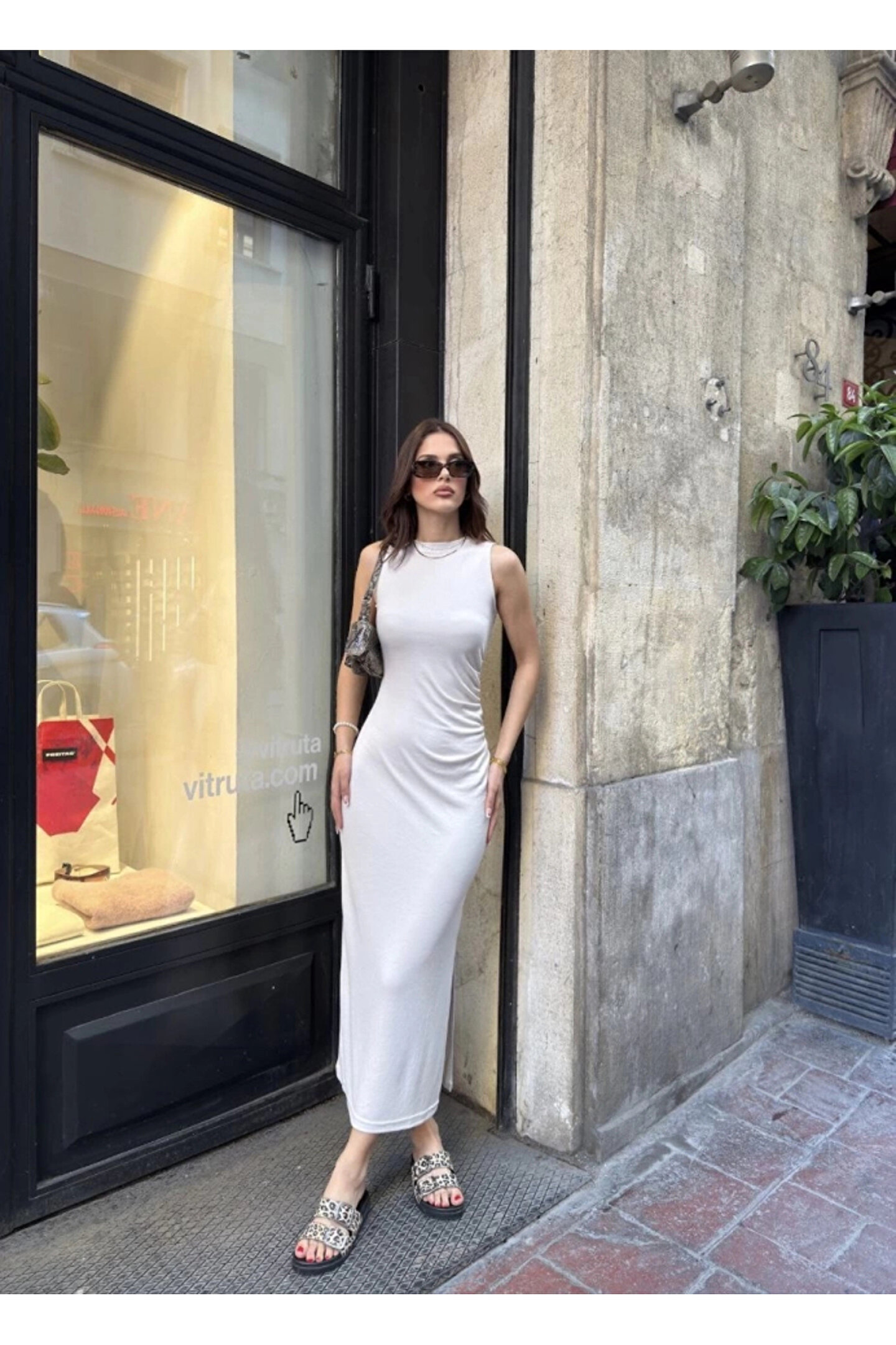 umira wear Osy Modal Dokulu Kumaş Bisiklet Yaka Kolsuz Yırtmaçlı Beyaz Elbise
