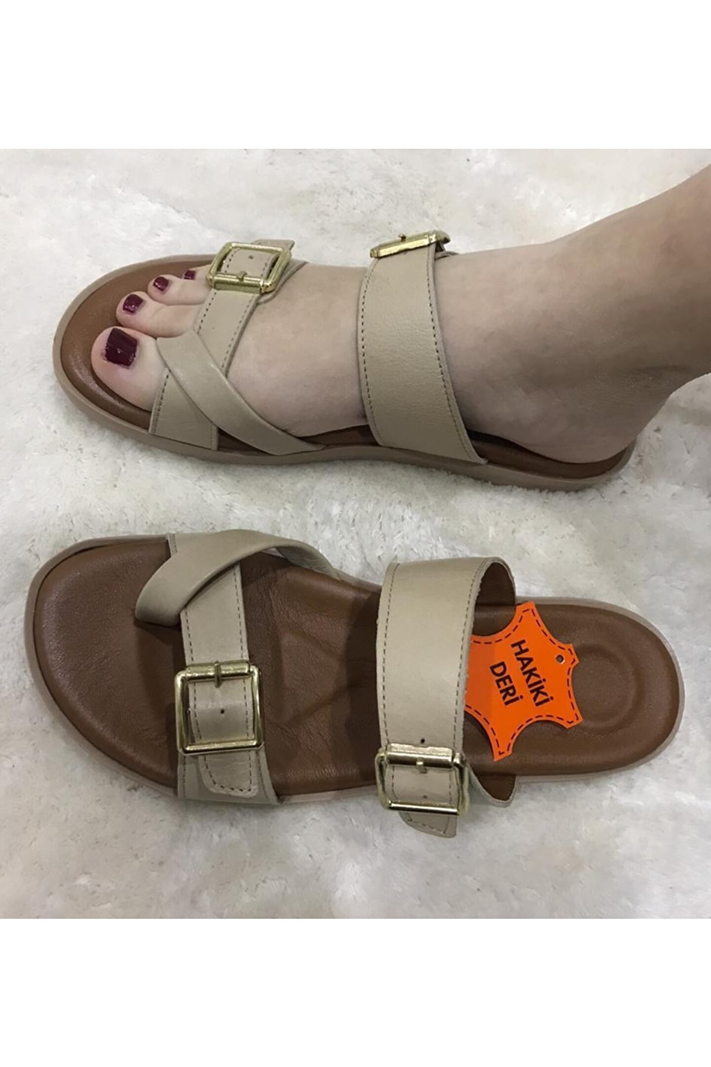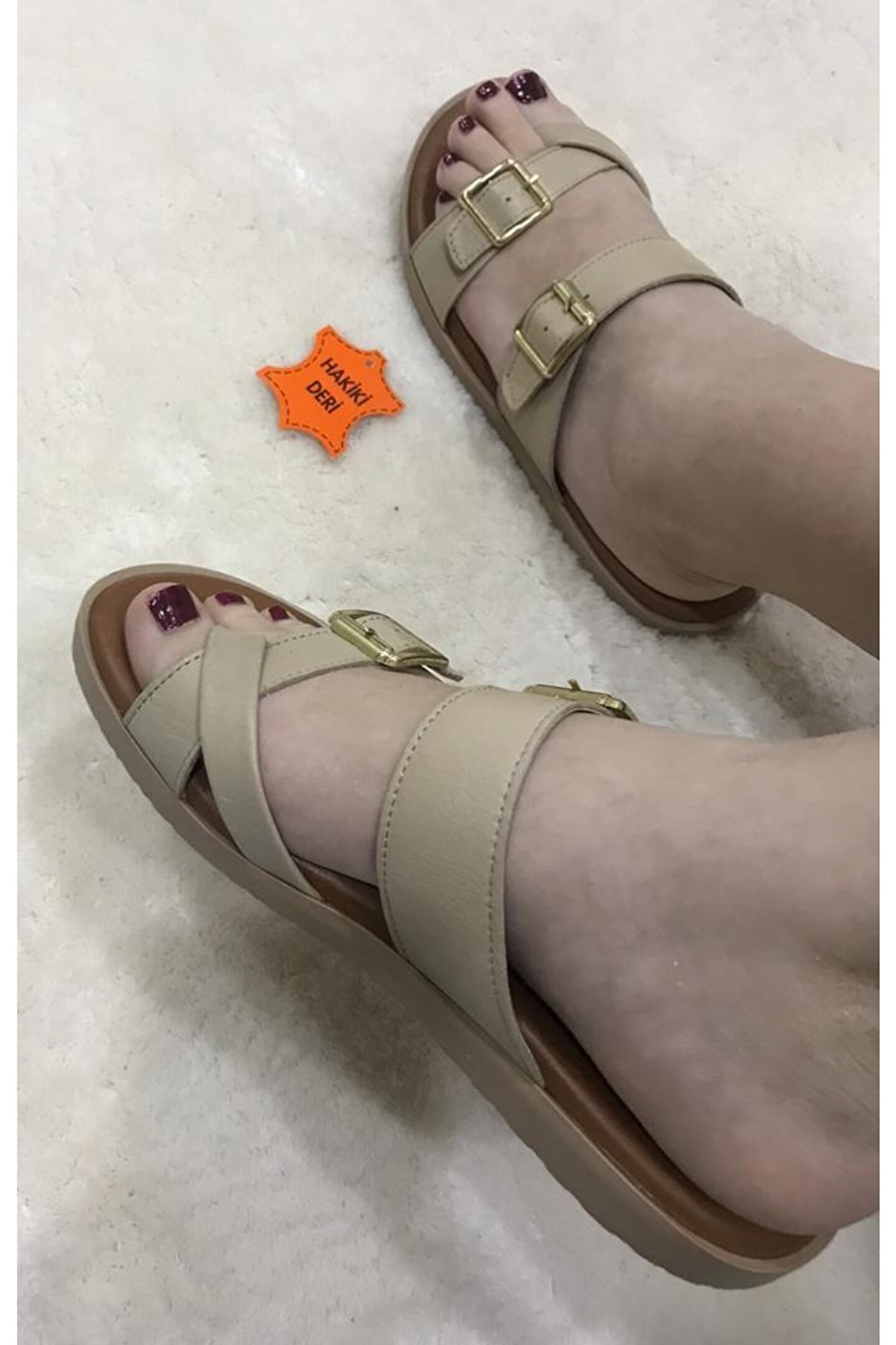 Hakiki deri iç taban materyali ile gün boyu konfor sağlar ve ayak sağlığınızı düşünerek tasarlanmıştır; Esnek ve dayanıklı kauçuk taban materyali sayesinde her adımınızda maksimum tutuş ve destek sunar; Düz topuklu tasarımı ile rahatlık ve şıklığı bir arada sunarken, günlük kullanım için idealdir; 1 ila 4 cm arasındaki kısa topuk boyu, doğal yürüyüş pozisyonunu destekler ve uzun süreli kullanımlarda bile konfor sağlar; Sade ve şık görünümüyle dikkat çeken düz deseni, yazlık ortamlarda kolayca kombinlenebilir; Saya kısmında kullanılan hakiki deri malzeme, dayanıklılığı artırırken estetik bir görünüm kazandırır; Ortopedik taban desteği ile ayak sağlığınız düşünülerek tasarlanmıştır; uzun süreli kullanımlarda bile ayaklarınızın rahat etmesini sağlar; Astarında da hakiki deri kullanılması, terliğin iç yapısının nefes alabilir olmasını sağlayarak ayaklarınızın gün boyu ferah kalmasına yardımcı olur;
