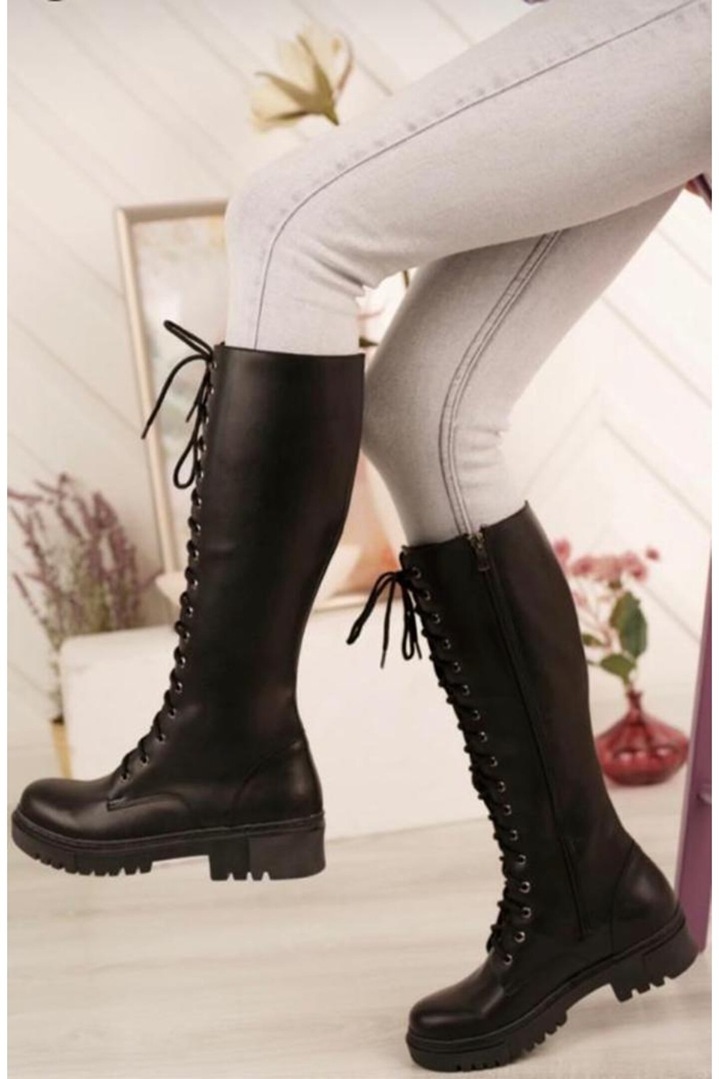 USLUFATİH Kadın Kışlık Bağcık Modelli Kalın Tabanlı Diz Altı Uzun Çizme
