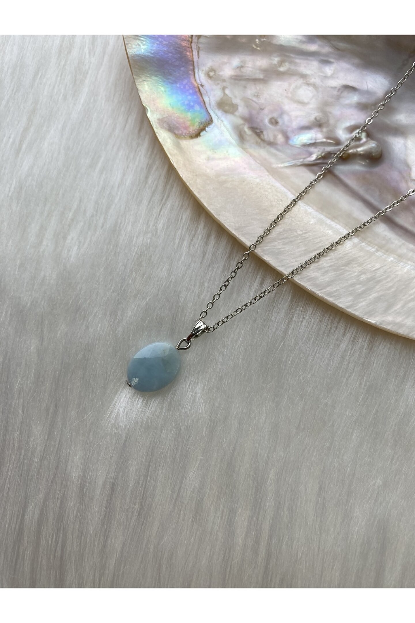 Doğal taş kullanımı, her bir kolyenin benzersiz ve otantik bir görünüm kazanmasını sağlar; Lak kaplama materyali, kolyenin parlaklığını artırarak göz alıcı bir ışıltı sunar; Akuamarin taşı, hem şıklığı hem de zarafeti temsil eder; her türlü kıyafetle uyum sağlar;