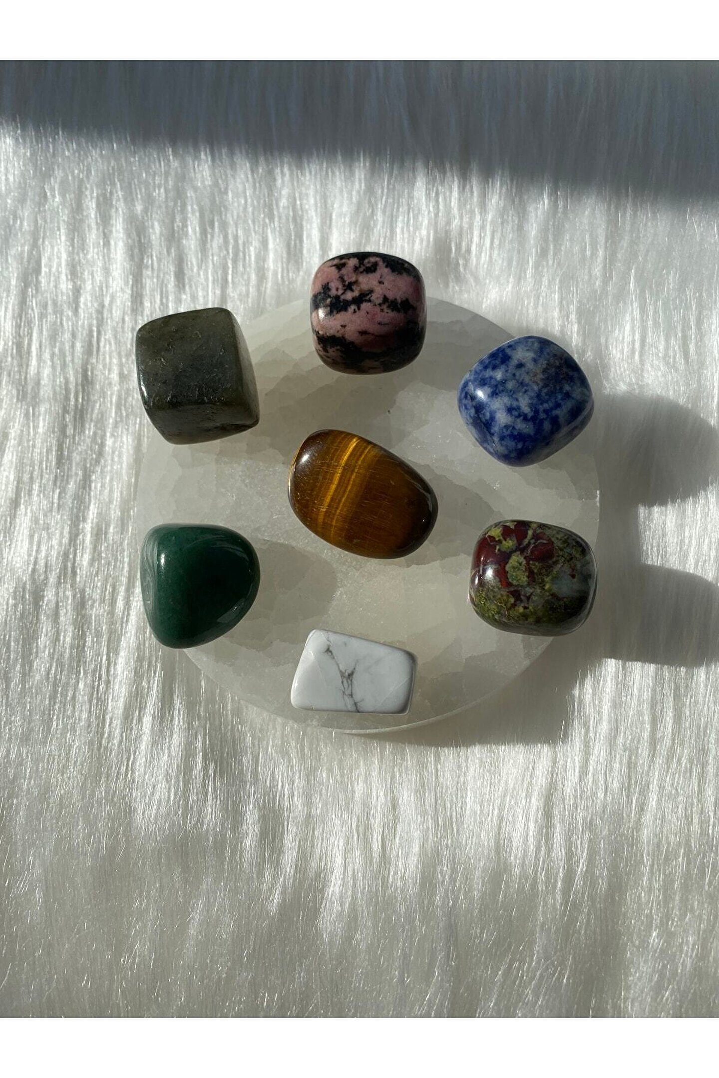 Setin içerisinde 7 adet tamburlanmış doğal taş bulunmaktadır. Fotoğraf temsilidir. Doğal taş olduğundan renklerde ve boyutlarında değişiklik gösterebilir. Setin içerisinde bulunan taşlar ; Kan taşı, Labradorit, Rodonit, Mavi Aventurin, Havlit, Aventurin ve Kaplan gözü bulunmaktadır. Alt çakralar, fiziksel benlik ve hayatta kalma ile ilişkili temel içgüdüleri yönetir. Yüksek çakralar ise düşünce ve bilinçle bağlantılı zihinsel özellikleri ve duyguları kontrol eder. Alt ve üst çakraları birbirine bağlayan ve hem fiziksel hem de duygusal yönleri birbirine bağlayan kalptir.