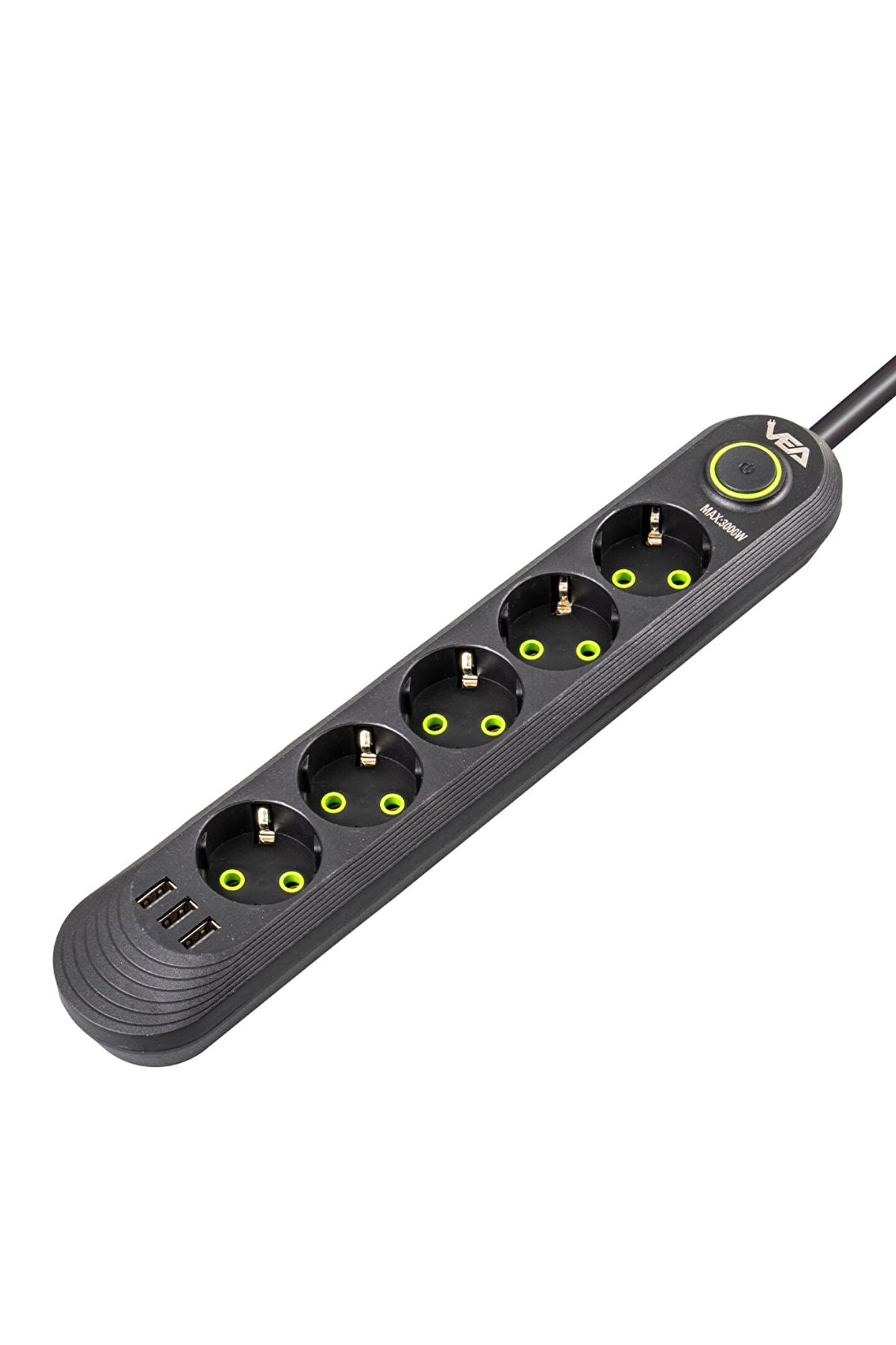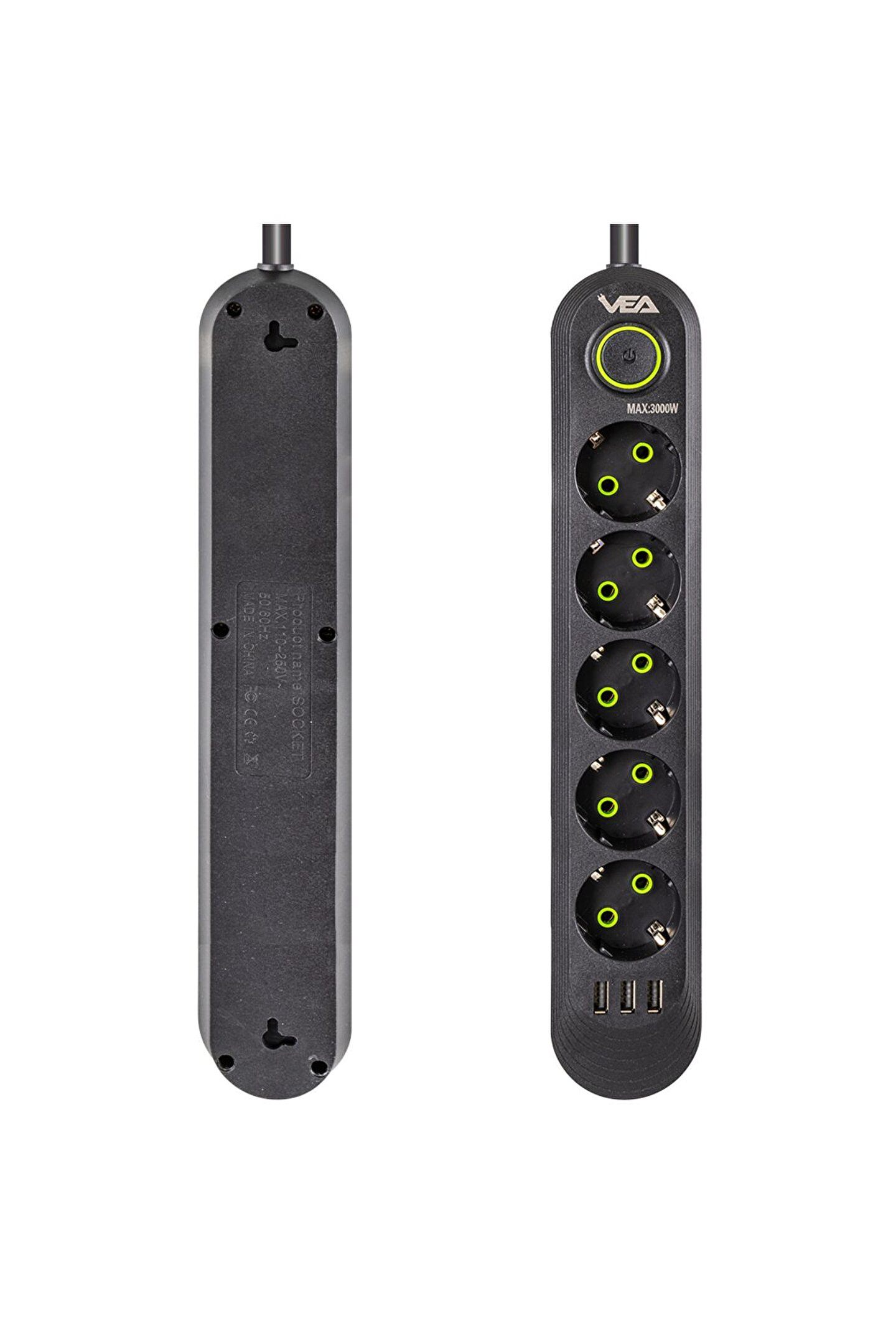 VA-21561 5Lİ 1.5 METRE KABLOLU 3 USBLİ SİYAH AKIM KORUMALI PRİZ Vea VA-21561 Akım Korumalı Priz Özellikleri Vea VA-21561, ev ve ofislerde enerji yönetimini kolaylaştırmak için tasarlanmış yenilikçi bir akım korumalı prizdir. Siyah renkteki şık tasarımıyla odanıza zarif bir görünüm kazandırırken, 1.5 metrelik kablo uzunluğu ile esnek kullanım imkanı sunar.