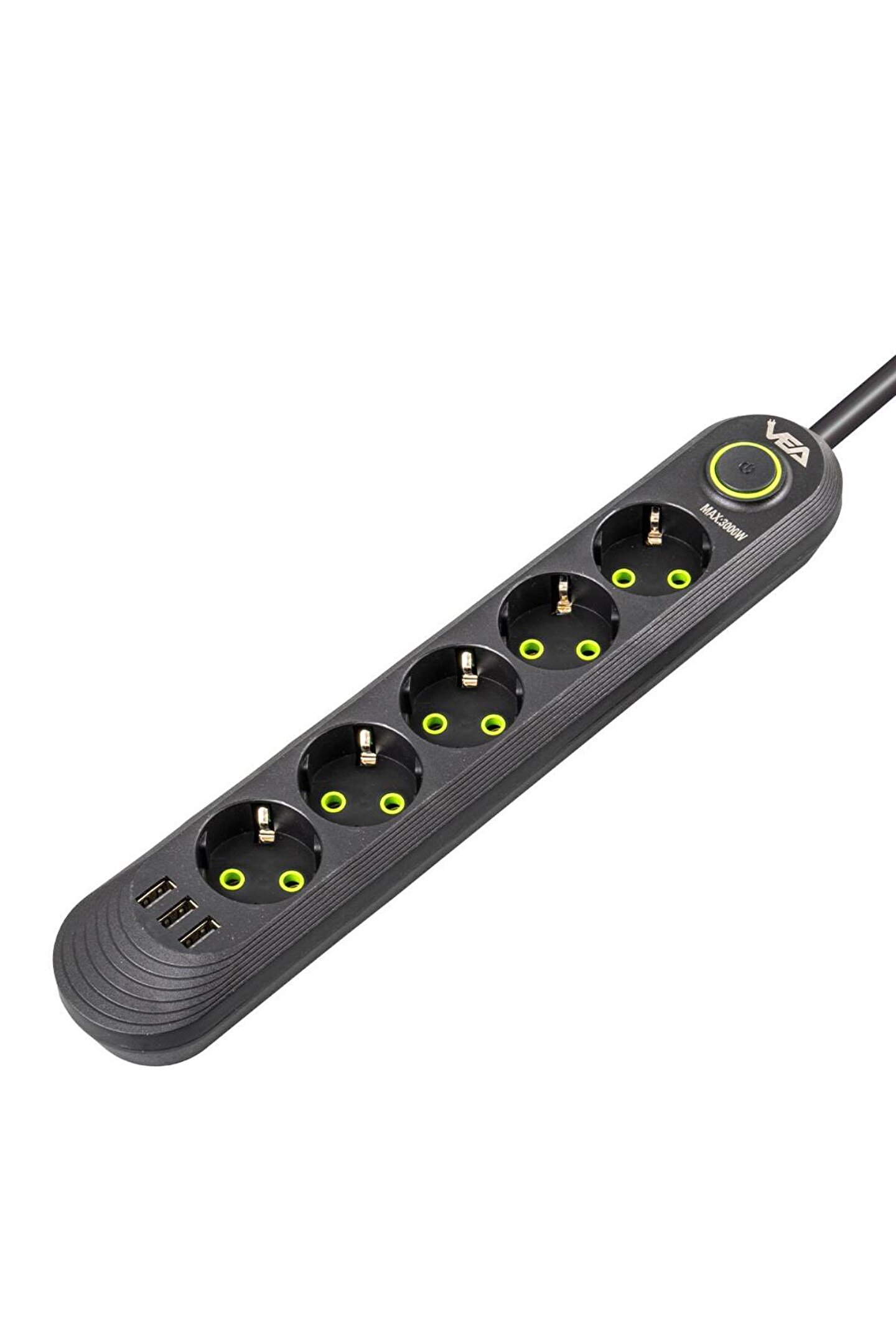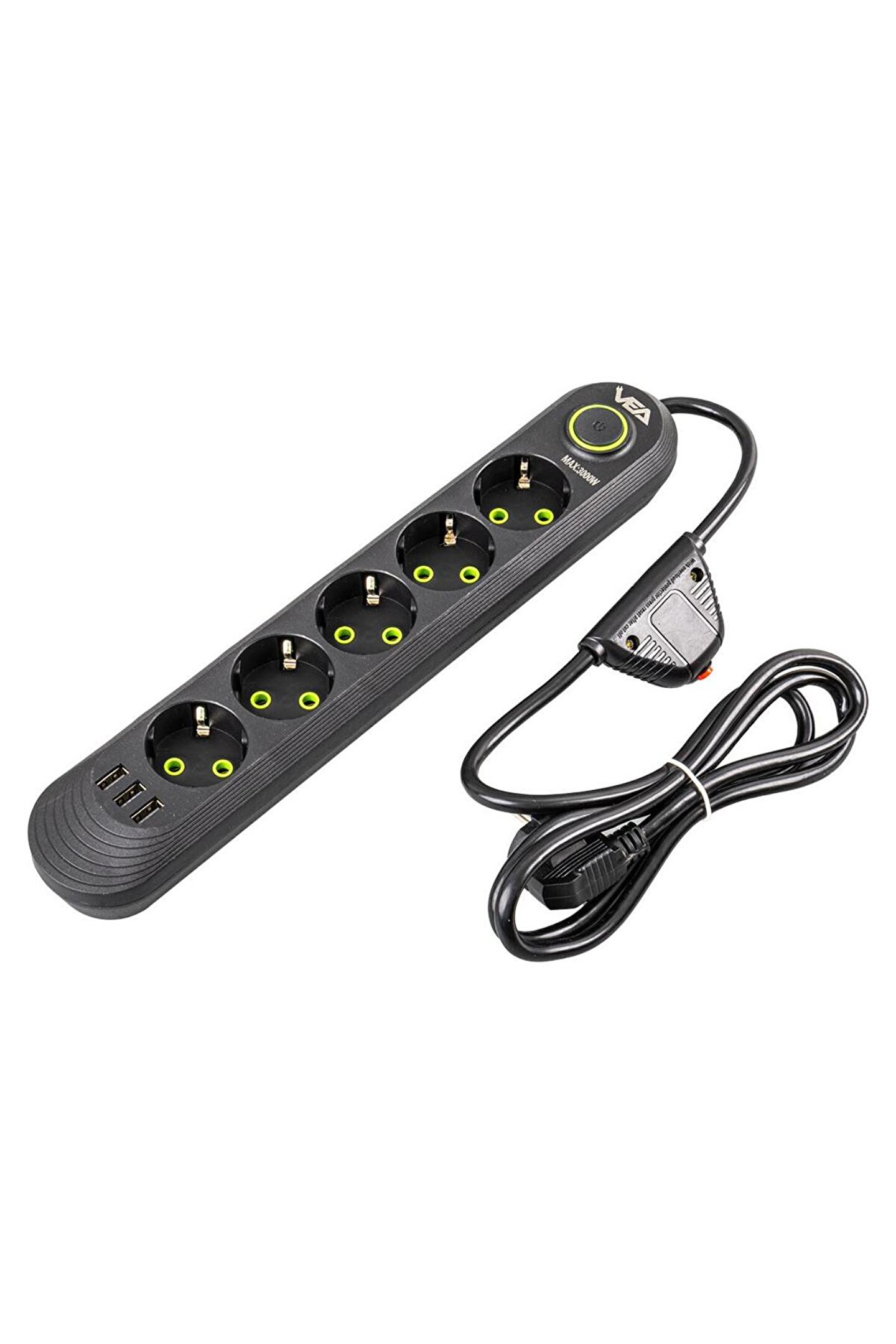 5 Priz ve 3 USB Çıkışı: Vea VA-21561, beş adet priz ve üç adet USB çıkışı ile donatılmıştır, böylece çok sayıda elektronik cihazı aynı anda şarj edebilir veya kullanabilirsiniz. Prizler, geniş aralıklı tasarımı sayesinde farklı priz tiplerine uyum sağlar.