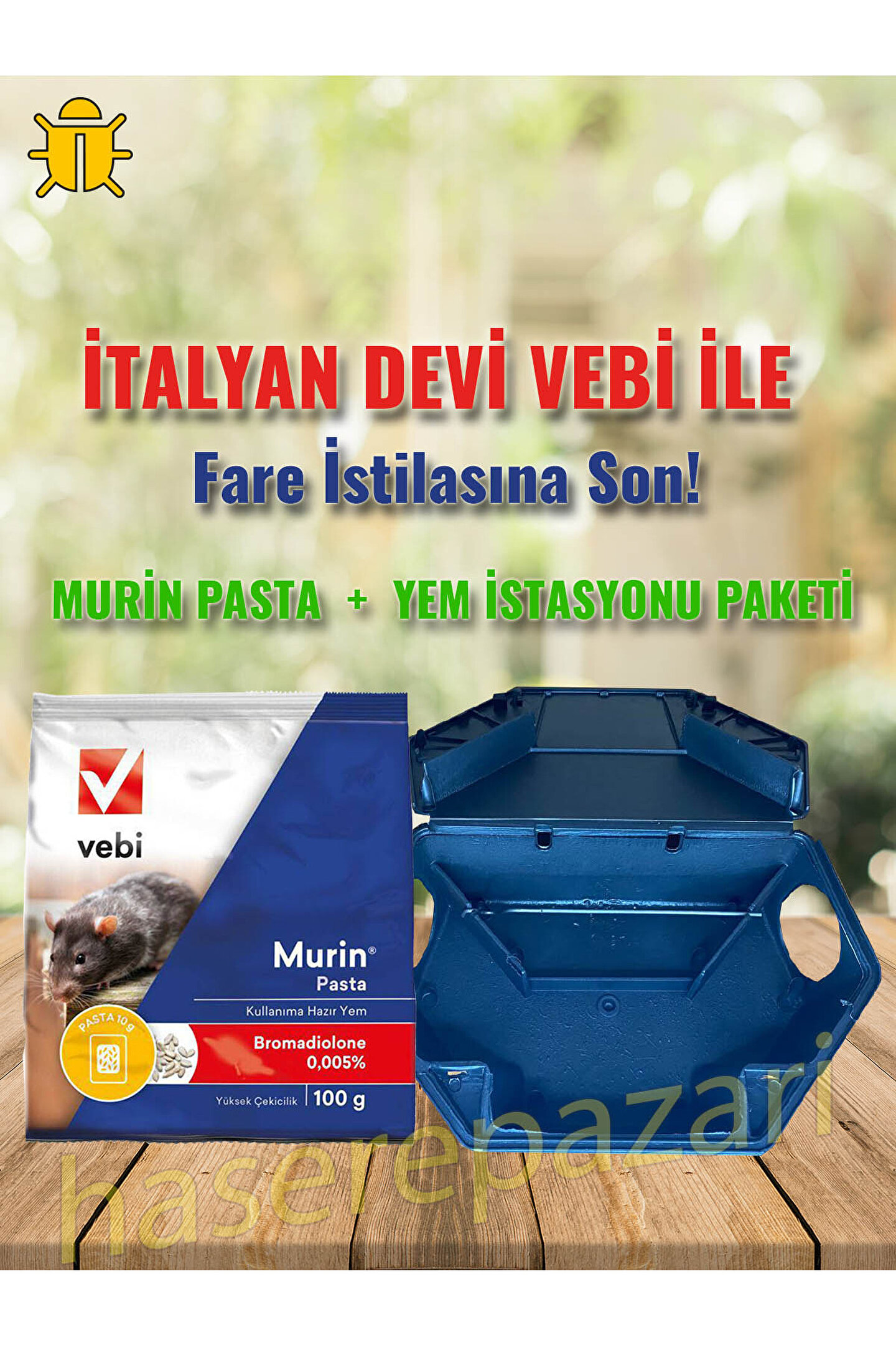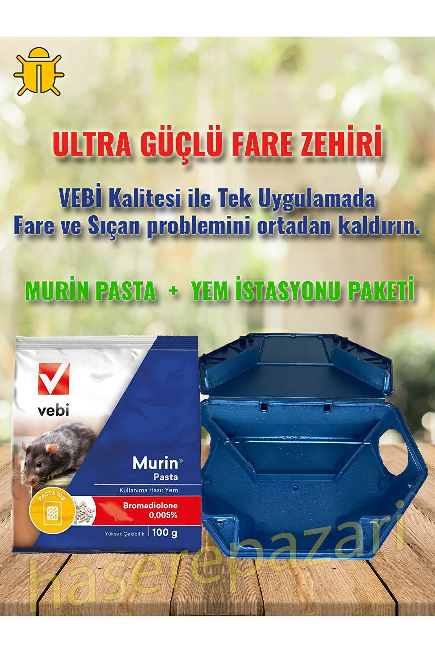Vebi murin pasta fare zehri 100 gr + Kilitli Yem İstasyonu Seti 2. ; Jenerasyon antikoagulant özellikte bromadiolone aktif maddesi içeren etkili ekonomik ve güvenli fare ve sıçan yemidir. ; Kilitli Yem İstasyonu, Hedef Canlıların Ulaşmasını Engeller. ; Yağmur ve Nemden Koruyarak Uzun Süreli Uygulama Sağlar. ; Fare ve sıçan için diğer yem kaynakları olsada cezbedici ayçekirdeği içerdiğinden daha çok tercih edilir. ; Su ve neme karşı dayanıklıdır. ; Dış ve iç alanlarda rahatlıkla kullanılır. ; Tek doz yem özelliği sayesinde bir kez beslenmeleri yeterlidir. ; Acı tat (denatonium benzoate) içerir. ; Insan ve hedef dışı canlıların kaza ile tüketmesini engeller. ; Tarla için ideal üründür. ; ithal ürün. ; Olağanüstü cazibesi, kemirgen kontrolünün kolayca yapılmasını sağlar. ; .;