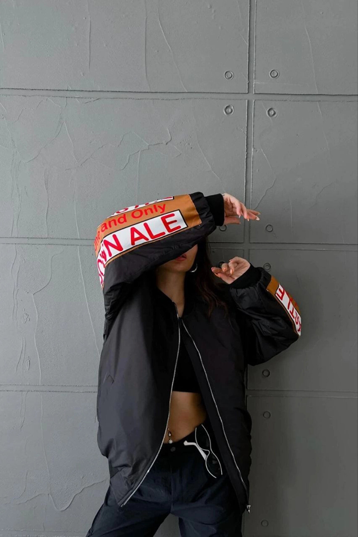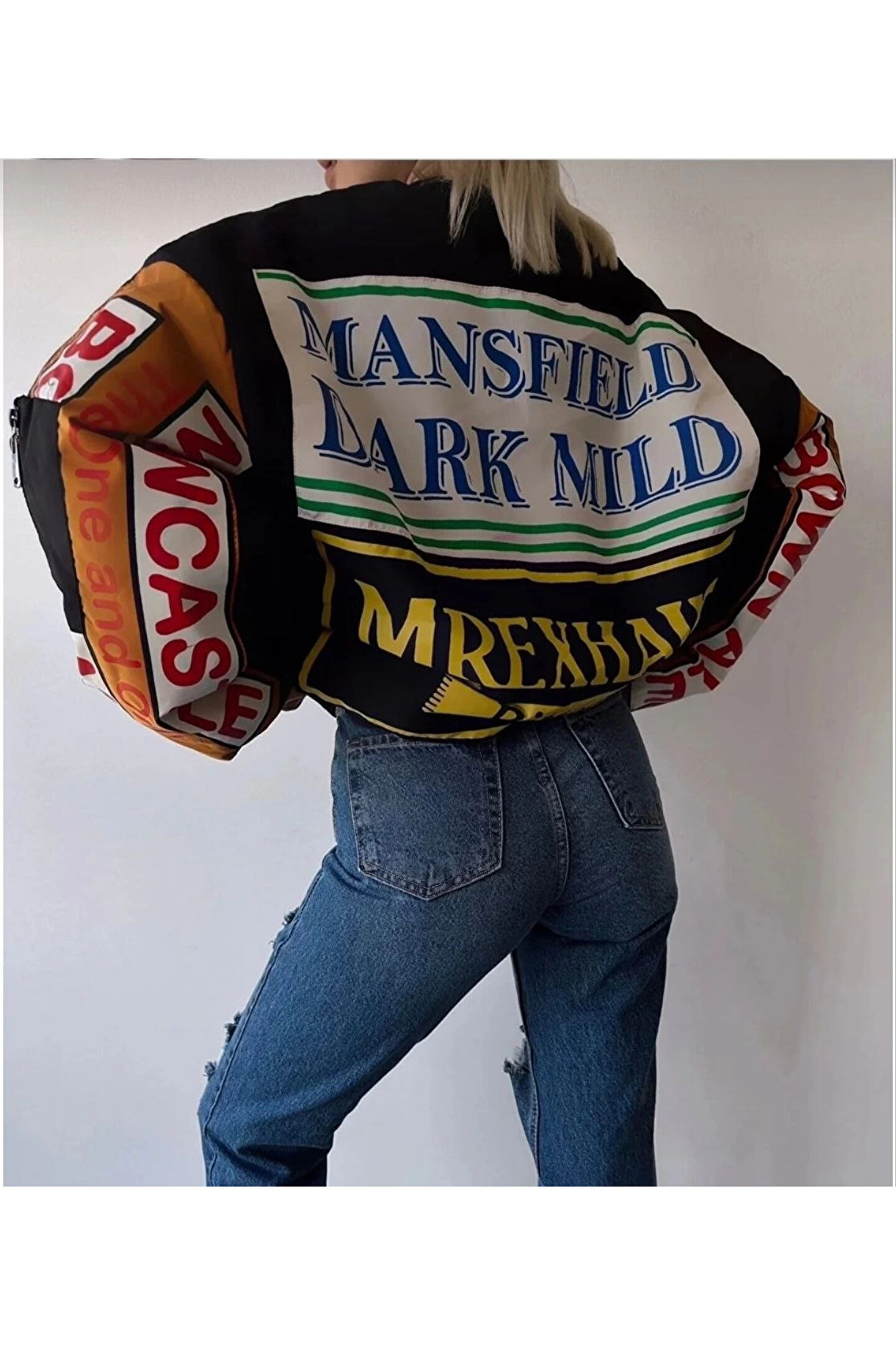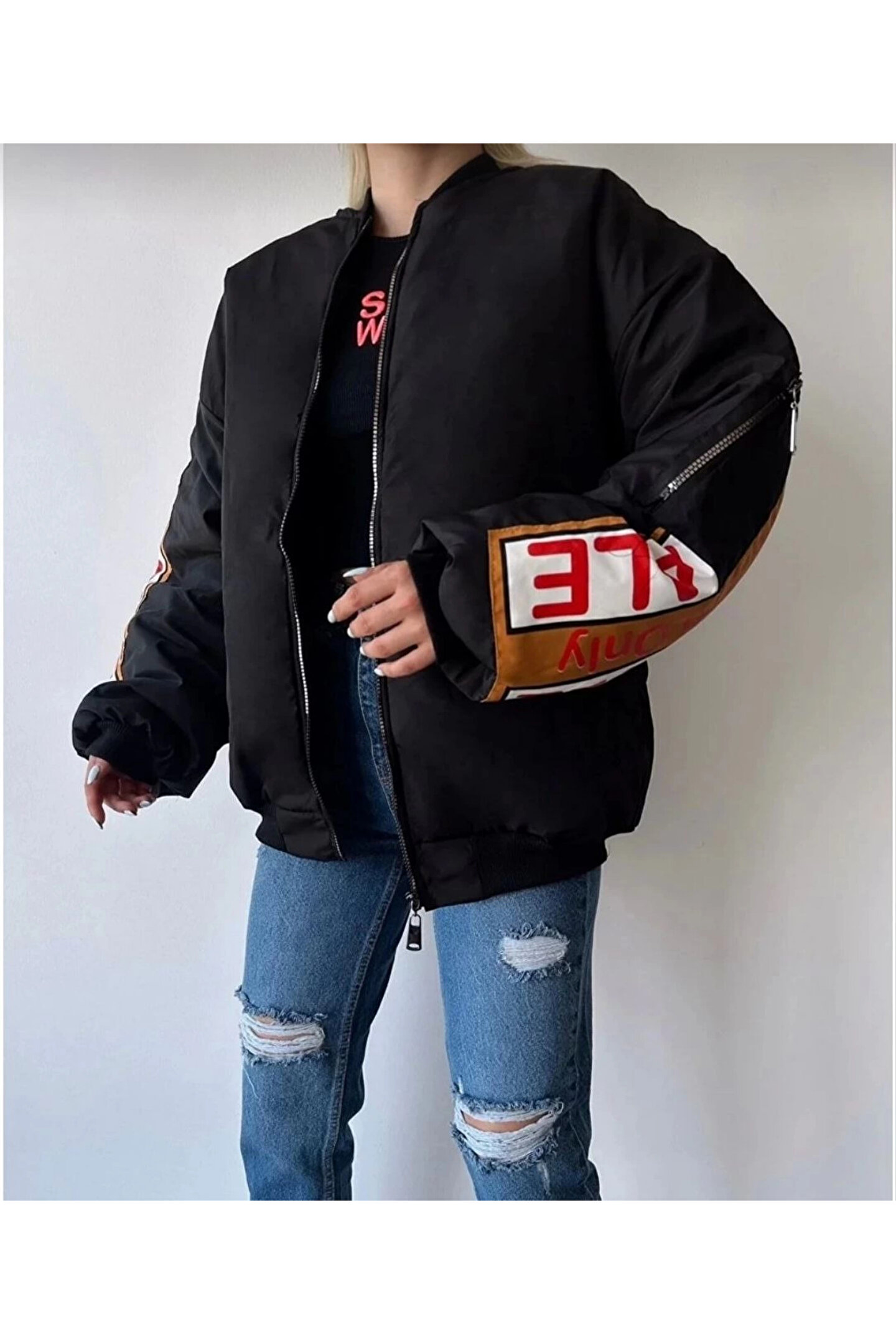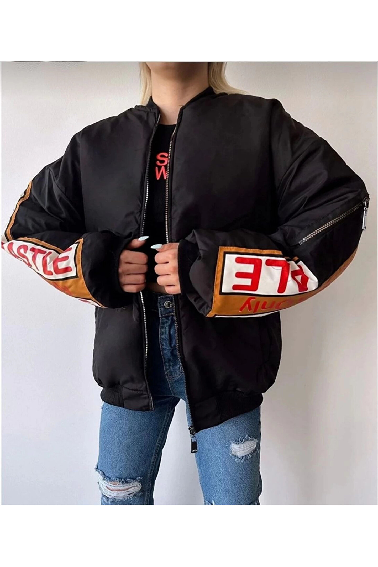 velmorafashion Kadın Sırt ve Kol Parça Baskılı Bomber Ceket - Siyah