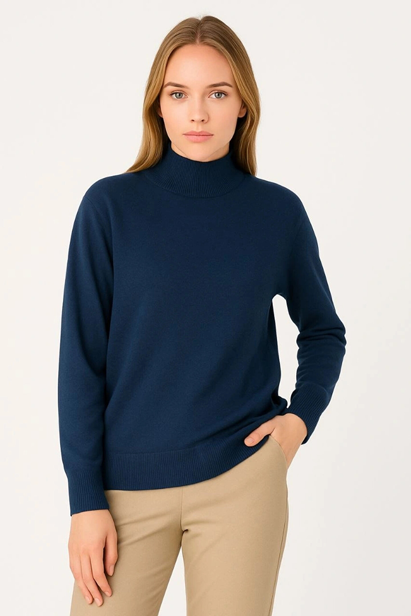 Yarım Boğaz Triko Kazak Yumuşak Dokulu Pamuklu Ince Dokuma, Uzun Kollu Rahat Regular Kalıp - Lacivert