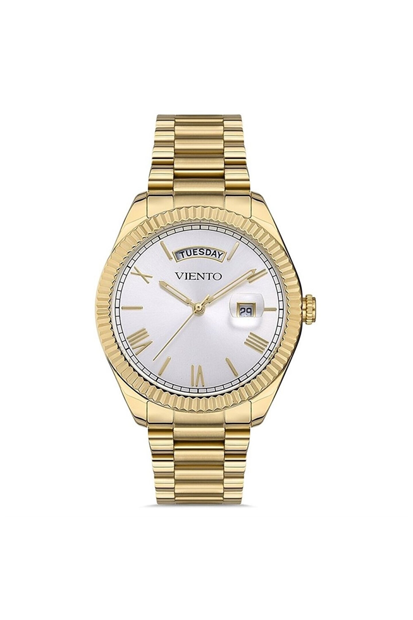 Markası: Viento Cinsiyet: Erkek saati Kasa Cinsi: Nano Metal Kasa Rengi: Sarı Kasa Ebatı:42mm Kordon Cinsi: Çelik Kordon Rengi: Sarı Kadran Rengi:Beyaz Cam Cinsi: Mineral Çalışma Şekli: Analog(Pilli) Takvim var Kronometre: Yok Su Geçirmemezlik: 3 Atm Garanti:24 Ay