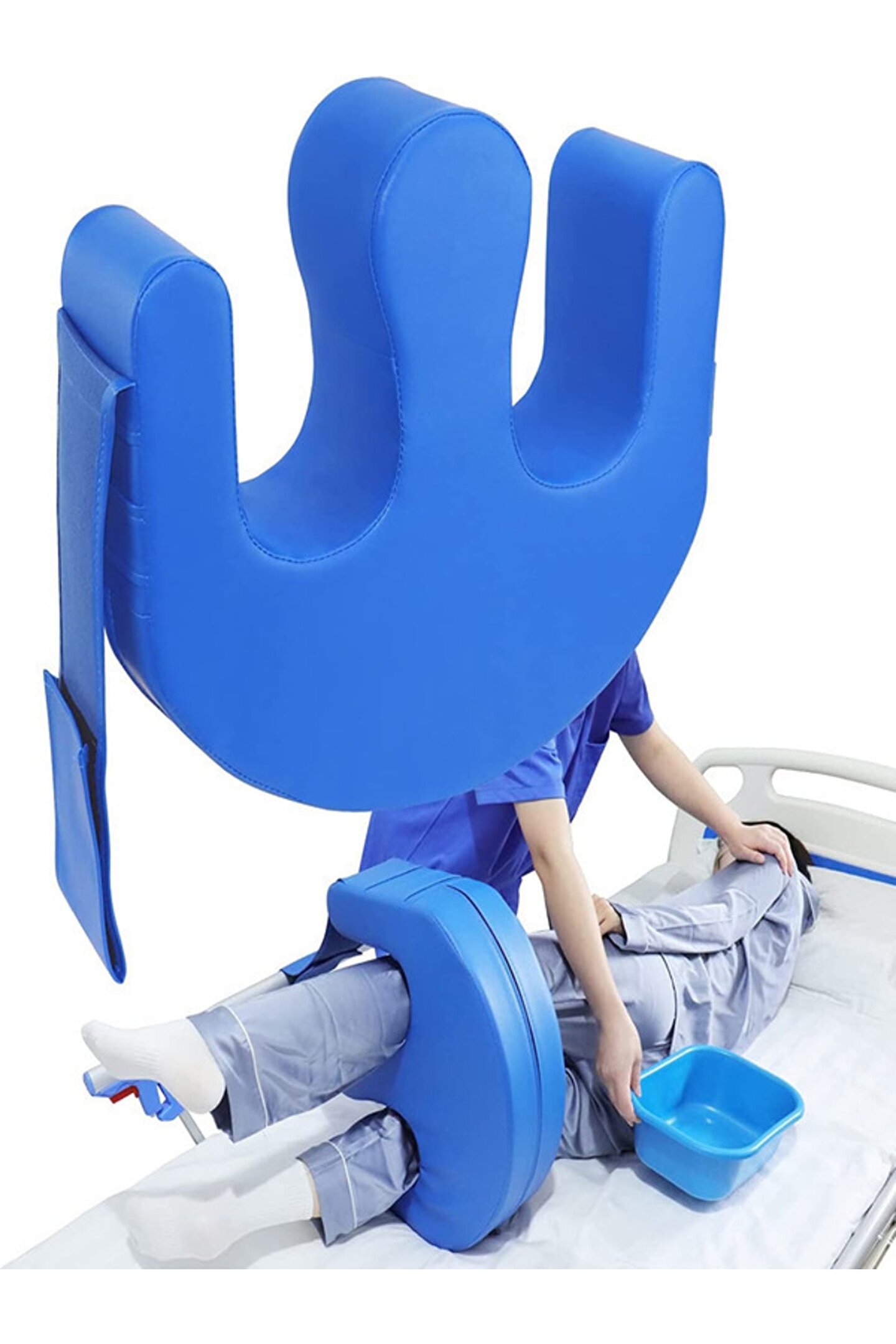 Hasta çevirme aparatı Ölçüler: 40 cm x 60 cm x 14 cm Yüzey malzemesi: poliüretan kumaş Iç malzemesi: yüksek yoğunluklu ve yüksek sertlikli sünger, özel üretim Ağırlık: 1,5 kg ; Bir kenarı hasta karyolasına tutturulabilir modeli.;