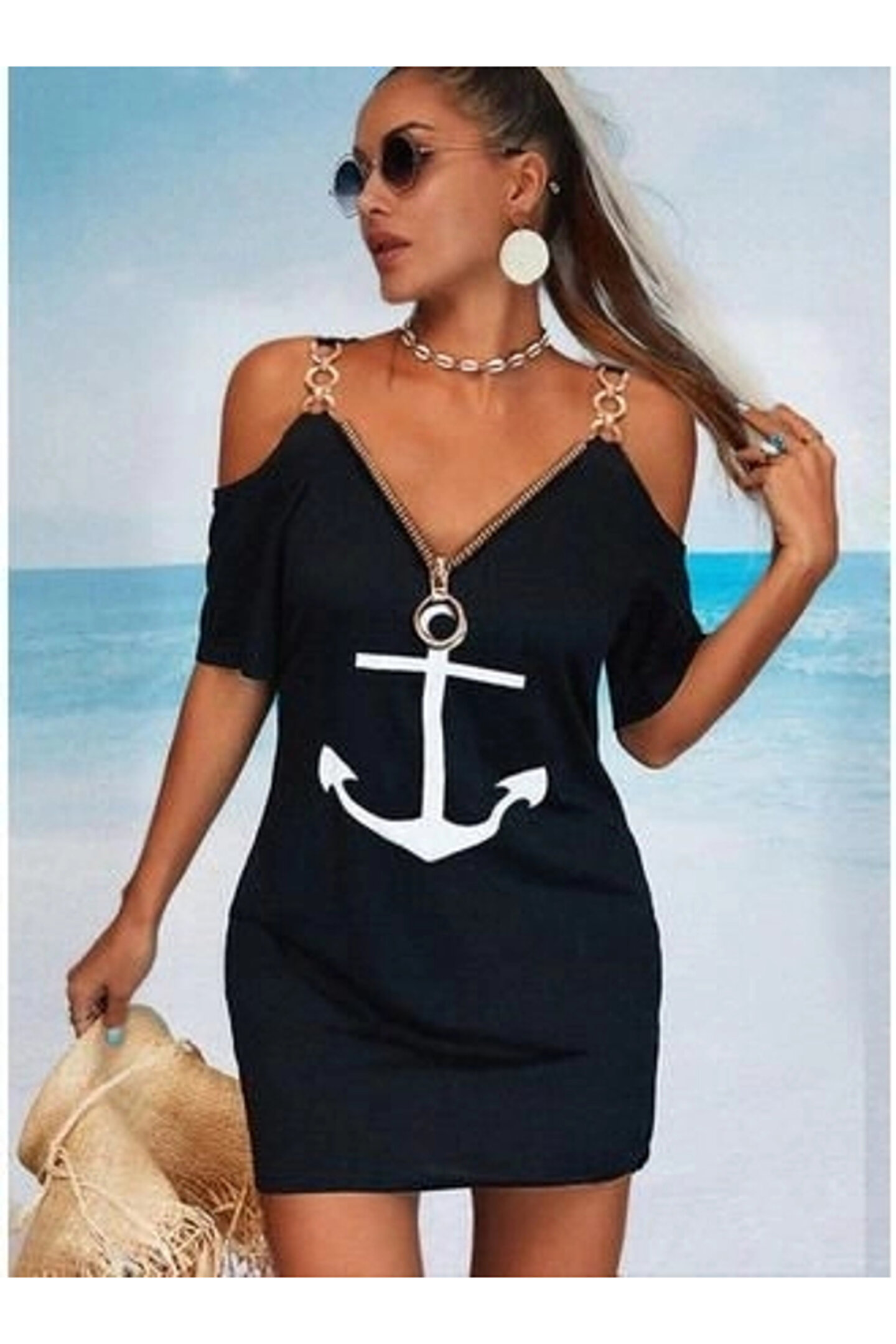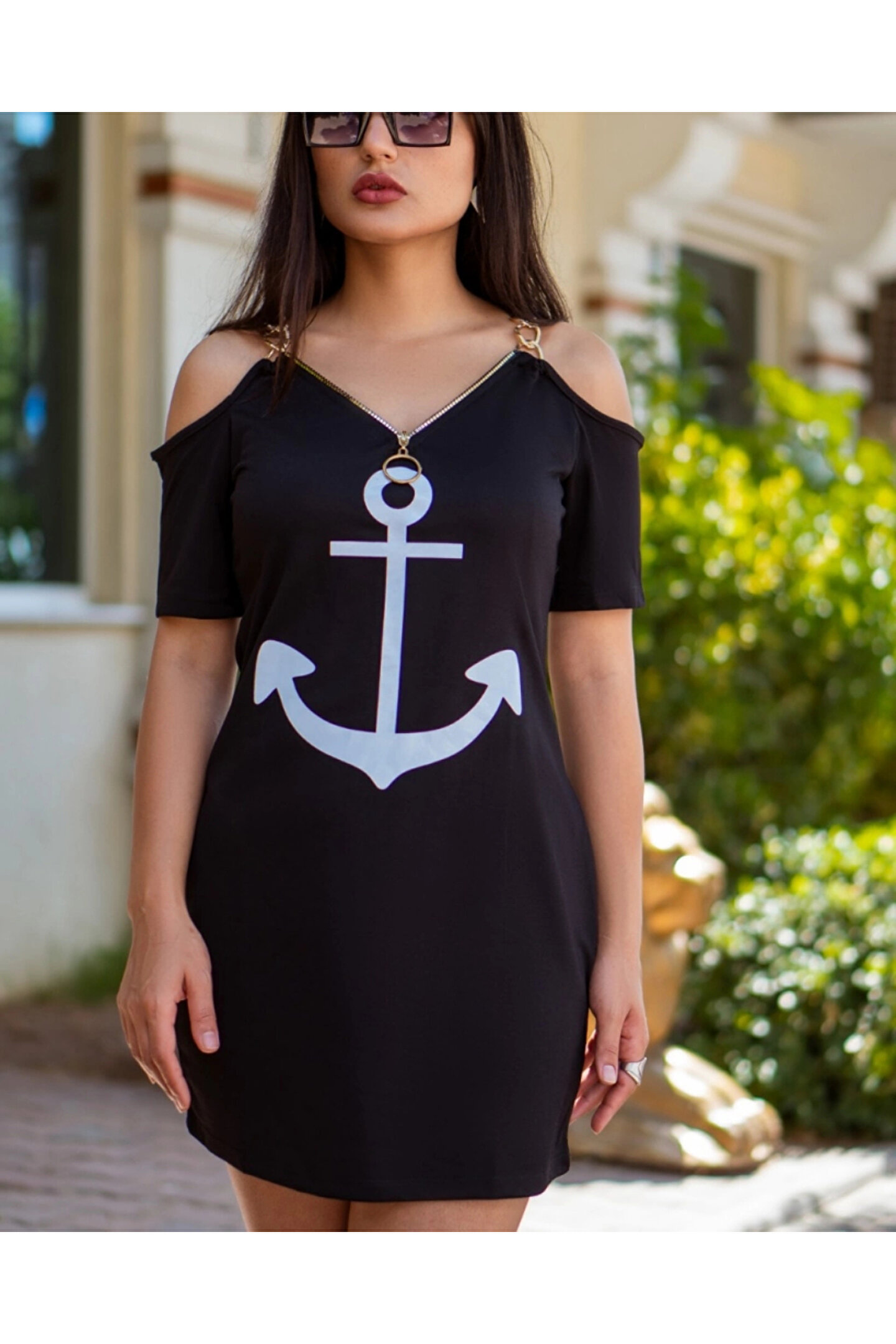 Fermuar Detay çıpa Baskılı Zincir Askılı Viskon Elbise