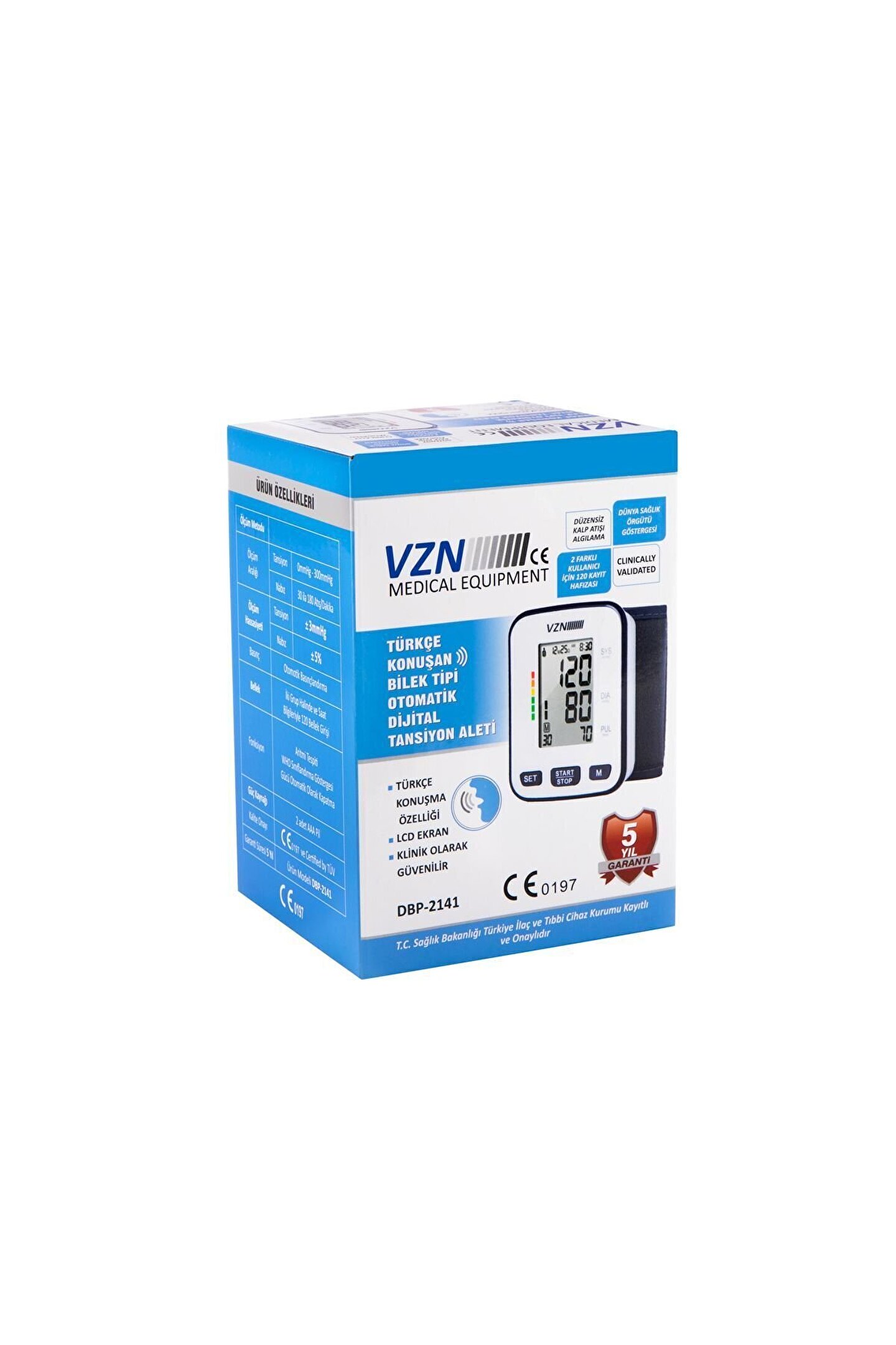 VZN BİLEK TİPİ KONUŞAN TANSİYON ALETİ DPB-2141 Türkçe konuşan • Düzensiz kalp atışı algılama • Dünya Sağlık Örgütü göstergesi • 2 farklı kullanıcı için 120 kayıt hafızası • LCD ekran • Klinik olarak güvenilir.; ; Önemli Ölçüm Rehberi: Ölçümden önceki 30 dakika içerisinde bir şey yemeyin, spor ve banyo yapmayın.; ; Ölçümden önce sakin bir ortamda en az 5 dakika oturun.; ; Ölçüm esnasında ayakta durmayın.; ; Rahat bir pozisyonda oturun ve bileğinizi kalbinizin hizasında tutun.; ; Ölçüm esnasında konuşmayın ve ya hareket etmeyin.; ; Ölçüm sırasında kuvvetli elektromanyetik parazit oluşturan mikrodalga fırın ve cep telefonu gibi cihazlardan uzak durun.; ; Tekrar ölçüm yapmadan önce en az 3 dakika bekleyin.; ; Daha tutarlı kan basıncı ölçümü için her gün aynı saatte ölçüm yapmaya çalışın.; ; Ölçümlerin birbiri ile kıyaslanabilmesi için aynı bilekten, aynı pozisyonda ve günün aynı saatinde yapılmış olması gerekir.; ; .; ; 2 yıl garantilidr;