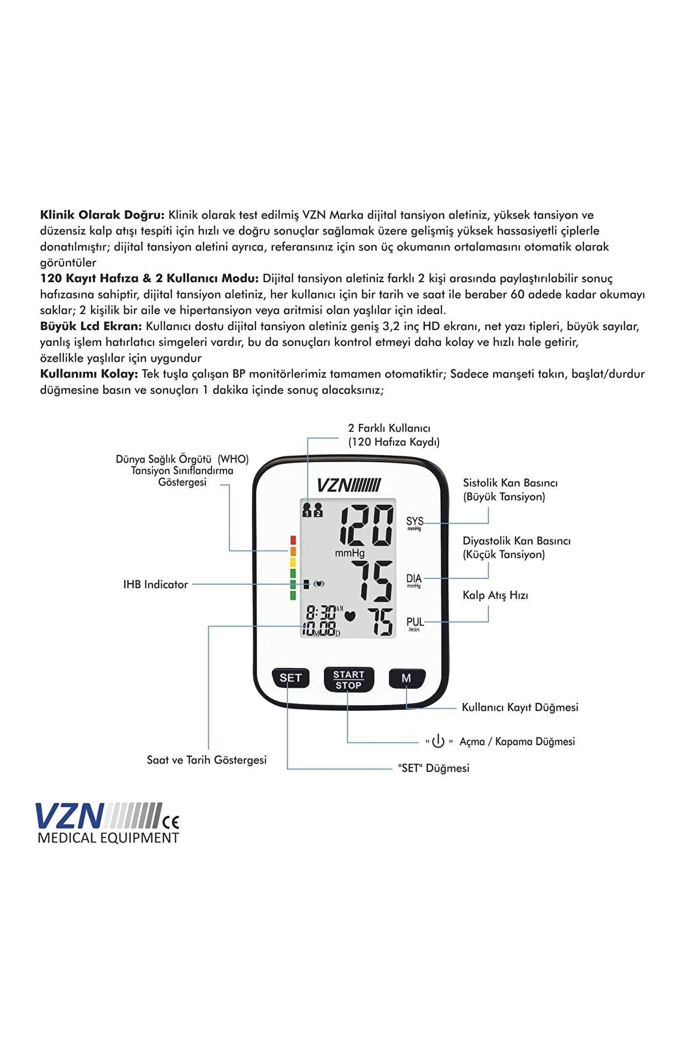 ; Klinik Olarak Doğru: Klinik olarak test edilmiş VZN Marka dijital tansiyon aletiniz, yüksek tansiyon ve düzensiz kalp atışı tespiti için hızlı ve doğru sonuçlar sağlamak üzere gelişmiş yüksek hassasiyetli çiplerle donatılmıştır; dijital tansiyon aletini ayrıca, referansınız için son üç okumanın ortalamasını otomatik olarak görüntüler ; 120 Kayıt Hafıza & 2 Kullanıcı Modu: Dijital tansiyon aletiniz farklı 2 kişi arasında paylaştırılabilir sonuç hafızasına sahiptir, dijital tansiyon aletiniz, her kullanıcı için bir tarih ve saat ile beraber 60 adede kadar okumayı saklar; 2 kişilik bir aile ve veya aritmisi olan yaşlılar için ideal ; Büyük Lcd Ekran: Kullanıcı dostu dijital tansiyon aletiniz geniş 3,2 inç HD ekranı, net yazı tipleri, büyük sayılar, yanlış işlem hatırlatıcı simgeleri vardır, bu da sonuçları kontrol etmeyi daha kolay ve hızlı hale getirir, özellikle yaşlılar için uygundur ; Kullanımı Kolay: Tek tuşla çalışan BP monitörlerimiz tamamen otomatiktir; Sadece manşeti takın, başlat/durdur düğmesine basın ve sonuçları 1 dakika içinde sonuç alacaksınız ; 5 YIL GARANTİ ; Bu Ürün Sağlık Bakanlığı Tıbbi Cihaz Kurumuna Kayıtlı ve Onaylıdır, Kutu Üzerindeki barkod bilgileri ile kontrol sağlayabilirsiniz.; ;