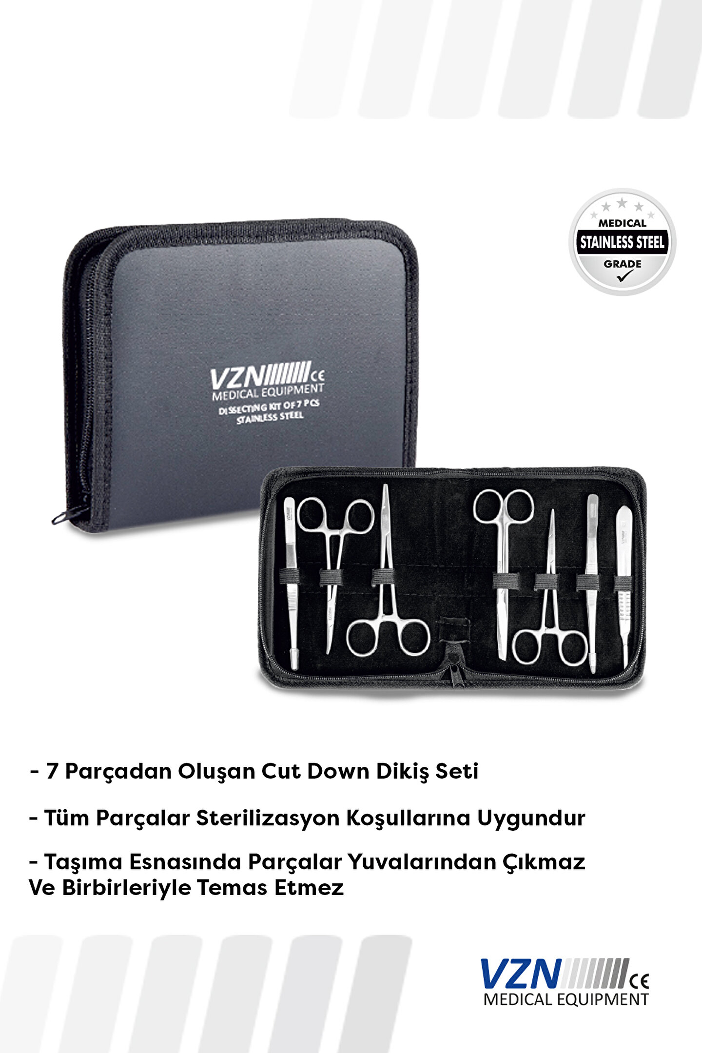 Açıklama Cut Down Dikiş Seti Toplam 7 parçadan oluşan Cut Down dikiş seti içerisinde 1’er adet portegü, bistüri sapı, klemp, hemostatik penset dişli, moskito eğri, koher pensi, makas eğri bulunmaktadır. ; Set özel fermuarlı vinleks taşıma çantası içerisindedir ve çanta içerisinde her cerrahi alet için özel yuva bulunmaktadır. ; Taşıma esasında parçalar yuvalarından çıkmaz ve birbirleriyle temas etmez. ; Set içerisindeki cerrahi el aletleri kullanım dışında çantasında muhafaza edilebilir. ; Tüm parçalar sterilizasyon koşullarına uygundur. ; CE normlarına uygun olarak üretilen Cut Down dikiş seti 2 yıl garantilidir.;