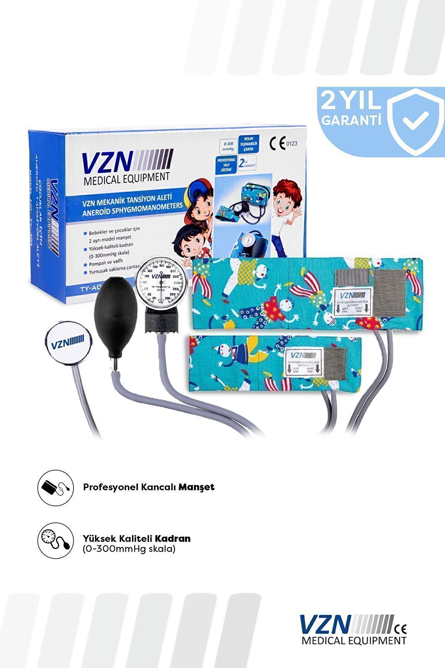Eğlenceli ve renkli tasarım minik kalpler için özel tasarım çocuklar için tıbbi deneyimleri olumlu ve keyifli hale getirmek, onların güvenini kazanmak için temel hedefimizdir.; Bu amaçla, aneroid tansiyon aletimiz eğlenceli ve renkli bir tasarıma sahiptir.; Canlı renkler ve sevimli desenler, çocukların dikkatini çekerek tansiyon ölçüm sürecini keyifli bir deneyime dönüştürür.; Küçük manşet boyu ile rahat kullanım çocukların hassas kolları için özel olarak tasarlanmış olan küçük boyutlu manşet ile doğru ölçümler elde etmek ve rahat kullanım sağlamak için idealdir.; Rahat bir oturuş ve düzgün bir oturma pozisyonu için tasarlanan manşet çocukların tedirginlik duymadan tansiyon ölçümü yaptırmasını sağlar, çocuklar ve bebekler için 2farklı manşet bulunmaktadır.; Yüksek kaliteli kadranlıdır.; (0-300 mm hg skala) pompalı ve valflidir.; ; Yumuşak saklama çantası vardır.; ; Ce onaylı tıbbi cihaz kurumu kayıtlıdır ;