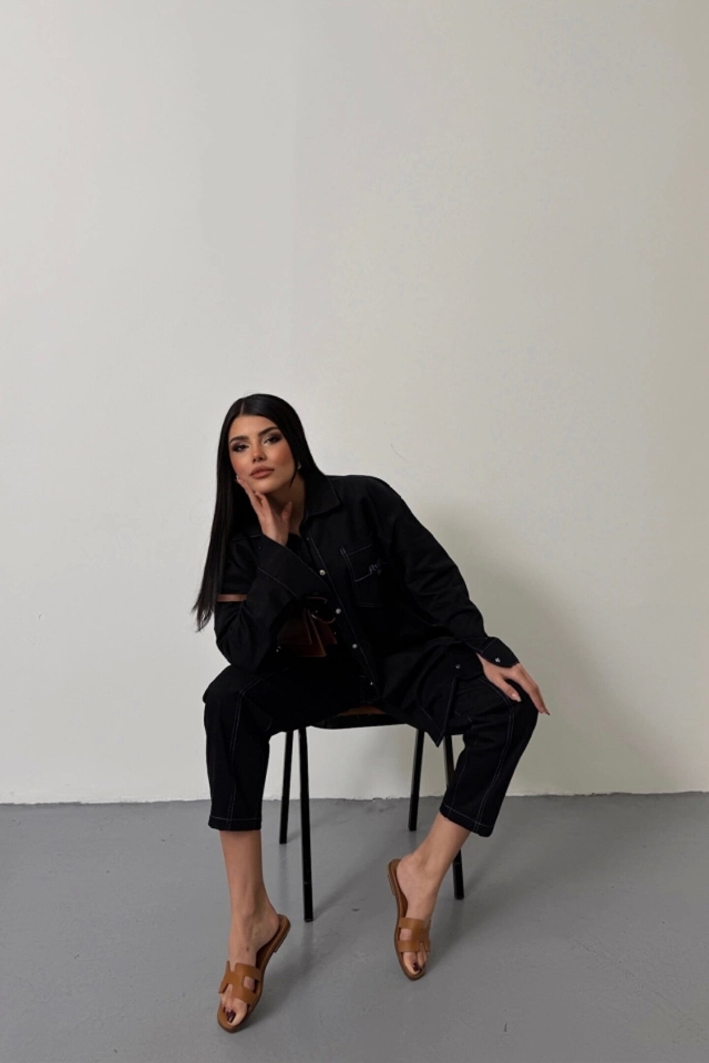 Kısa Crop Blazer Ceket Pantolon Ikili Takım - Siyah