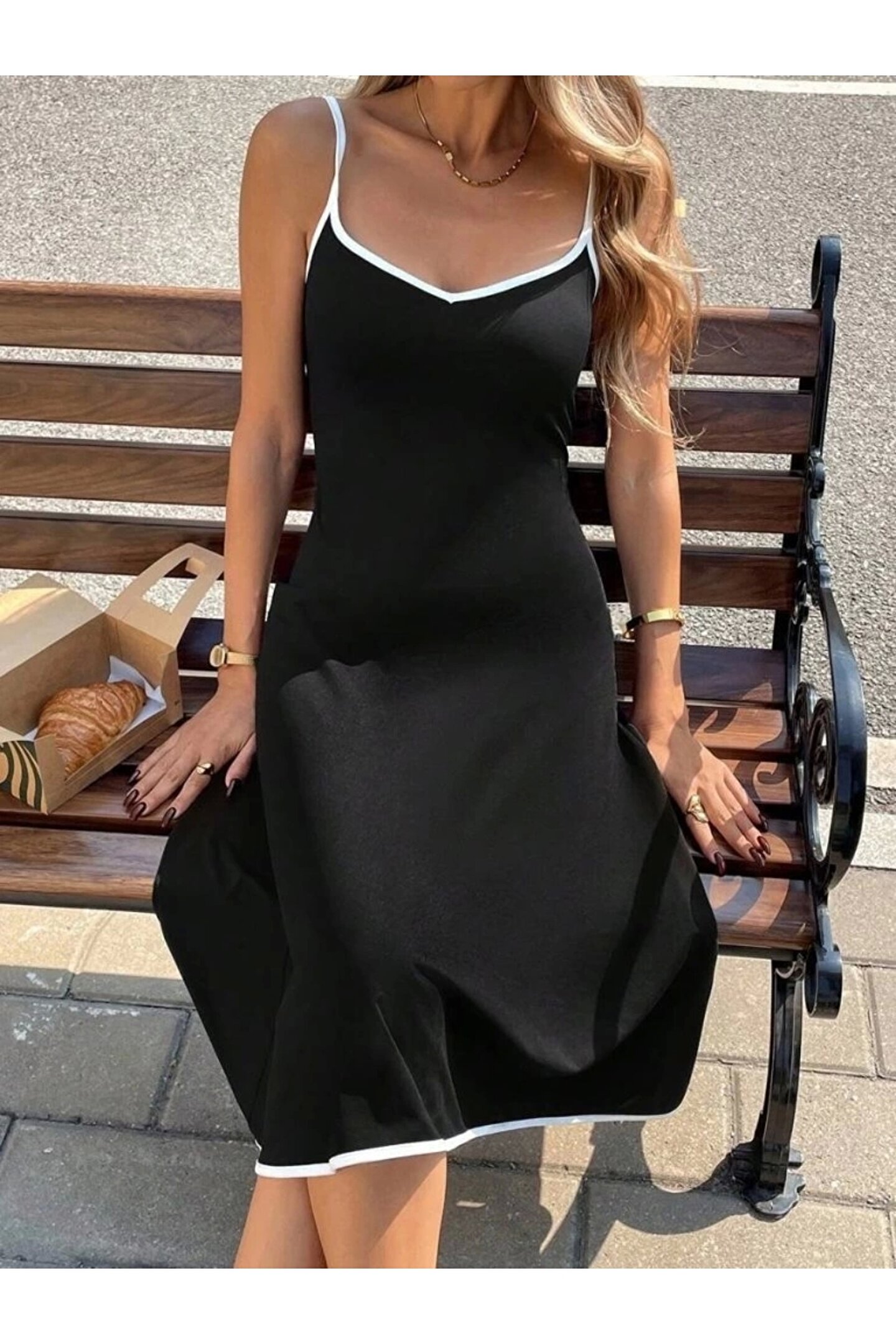 Kadın Ip Askılı Geniş V Yakalı Midi Janjan Krep Elbise