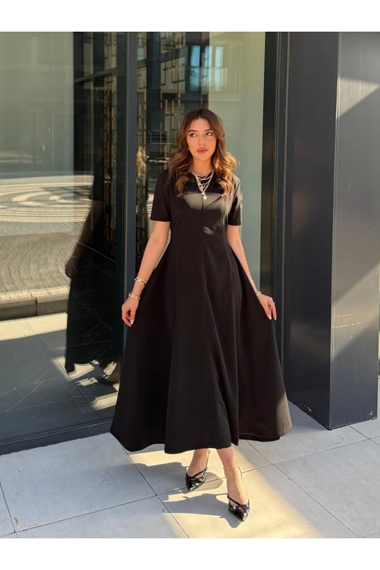 Wear Up Kadın Kısa Kollu Bisiklet Yaka Maksi Boy Ithal Krep Elbise