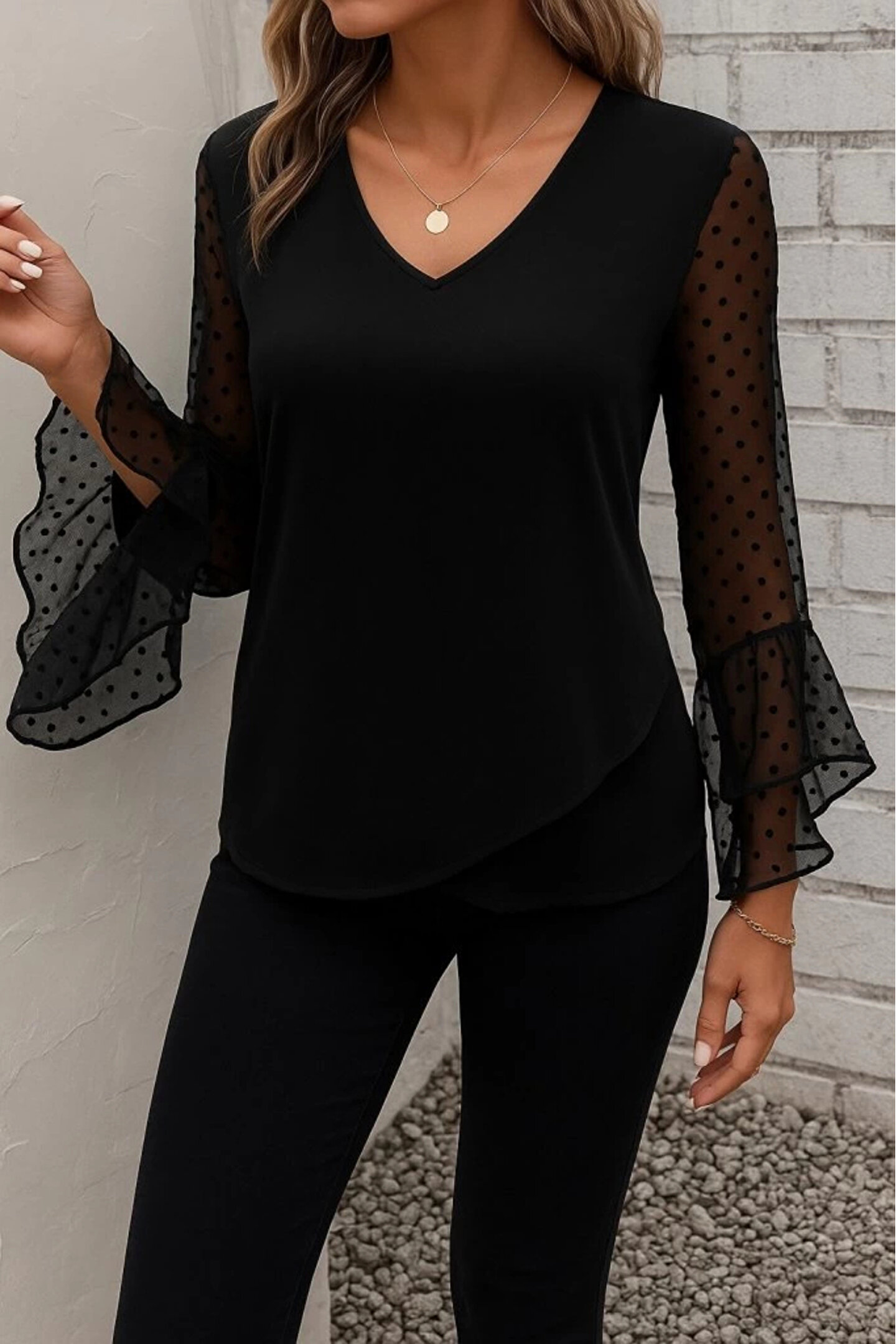Kadın Uzun Kollu V Yakalı Kolları Ispanyol Detayı Sandy Bluz