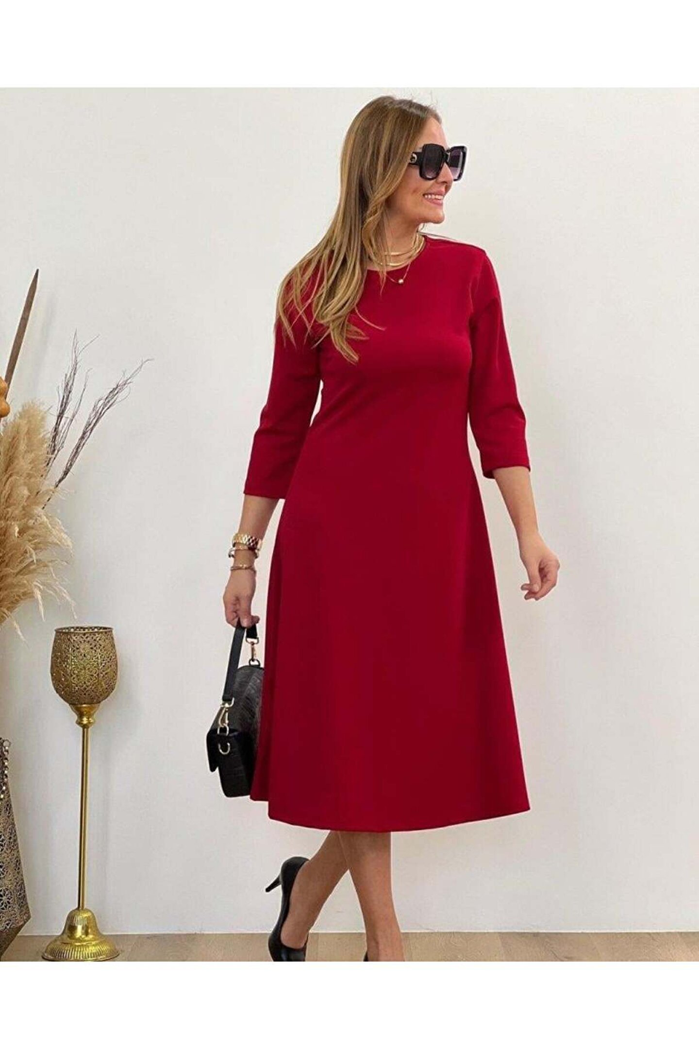 Kadın Uzun Truvakar Kol Bisiklet Yaka Midi Modal Elbise