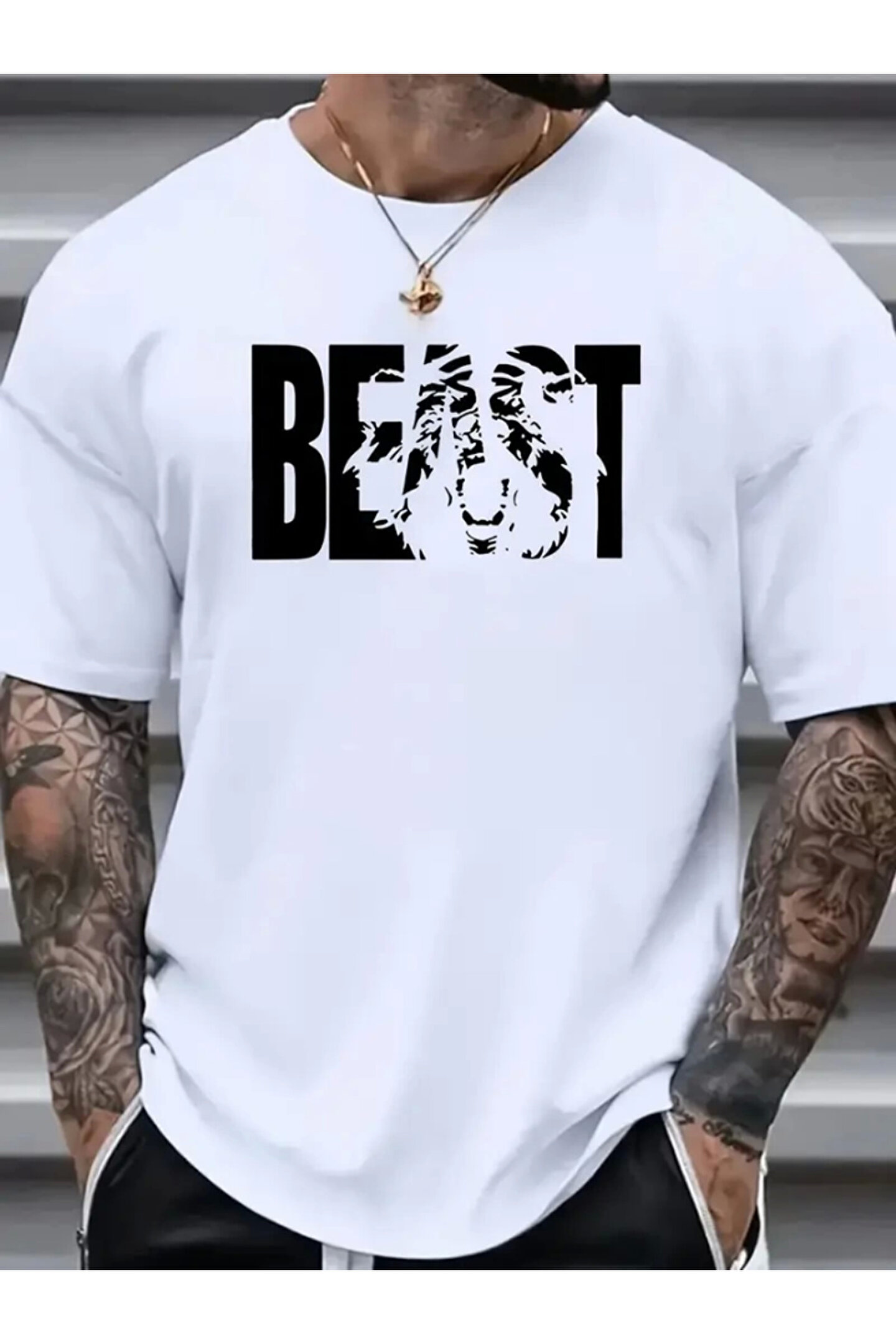 Baskılı Oversize Bisiklet Yaka T-shirt - Beyaz