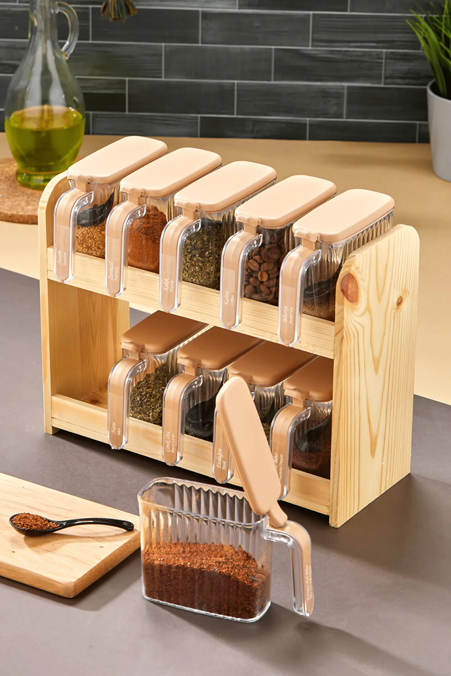 Set İçeriği: 10 adet şeffaf kapaklı baharatlık + 1 adet doğal ahşap stand