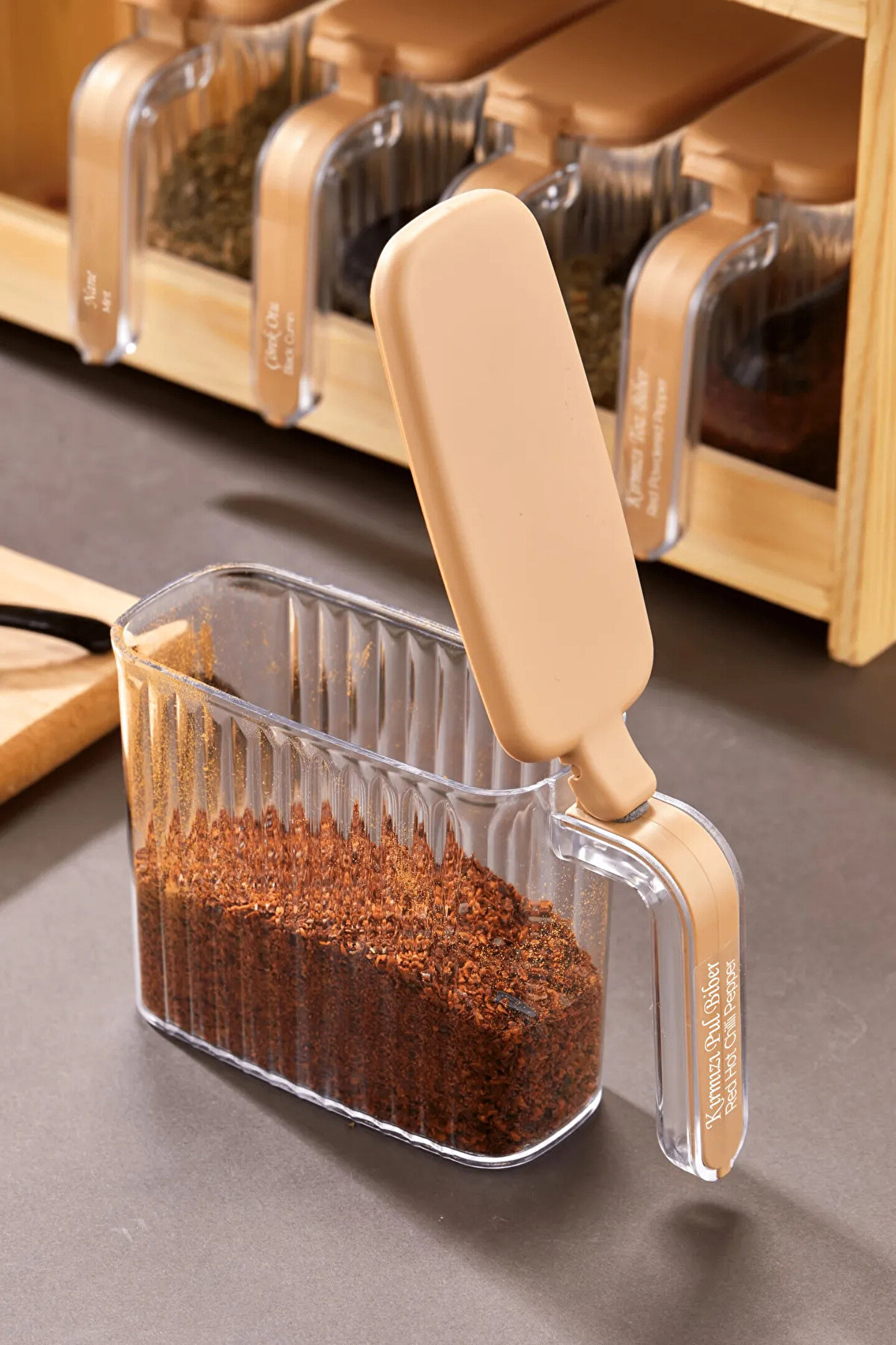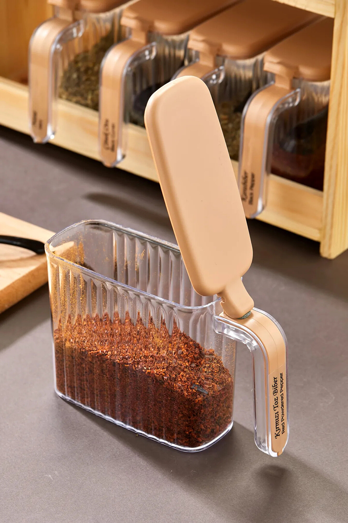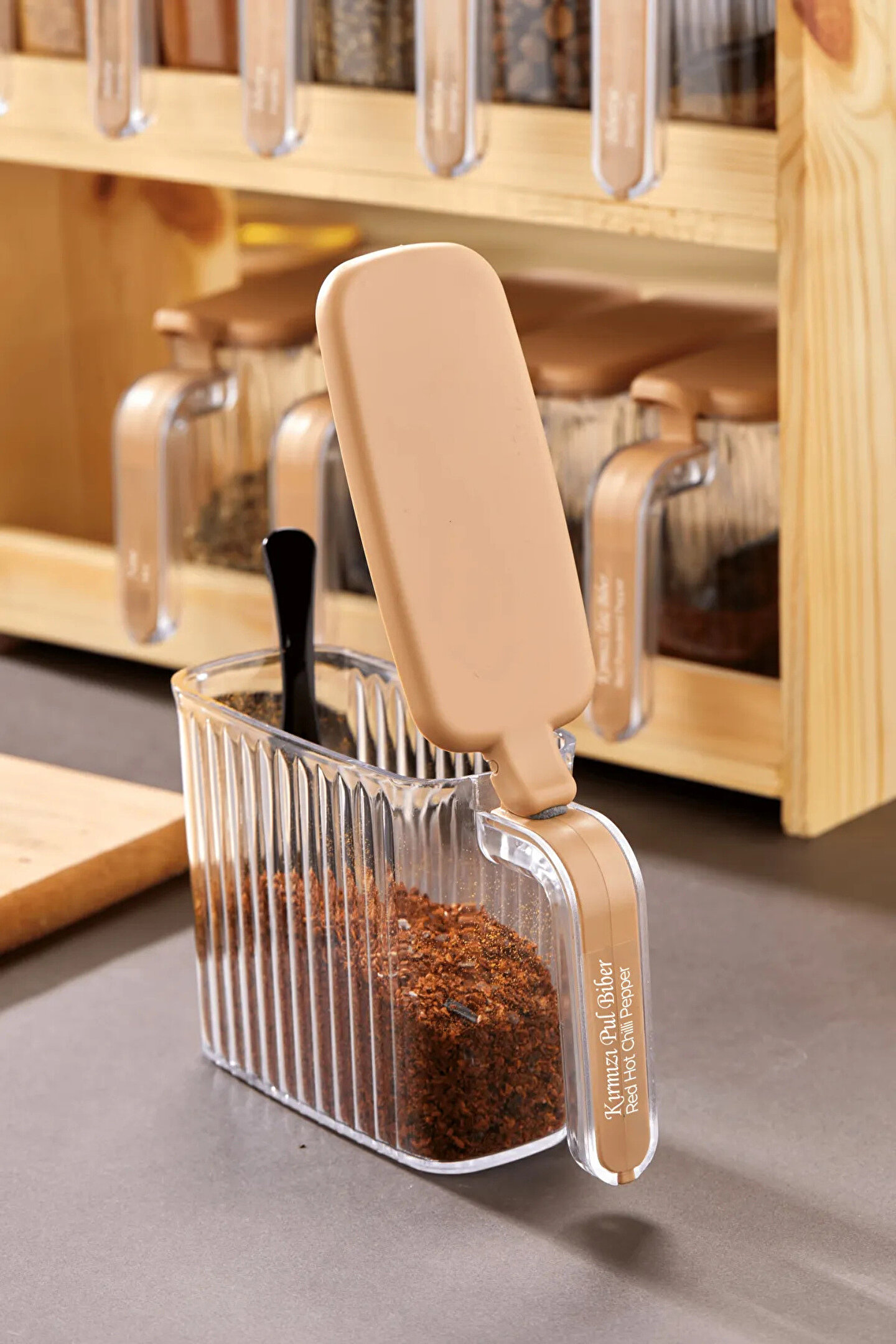 Her bir kavanoz, kulplu ve pratik kapak tasarımıyla kolay kullanım sunar. Stand üzerinde düzenli bir şekilde konumlanan baharatlıklar mutfağınızda yerden tasarruf sağlar. Toz, tane ve yaprak formundaki tüm baharatlar için uygundur.