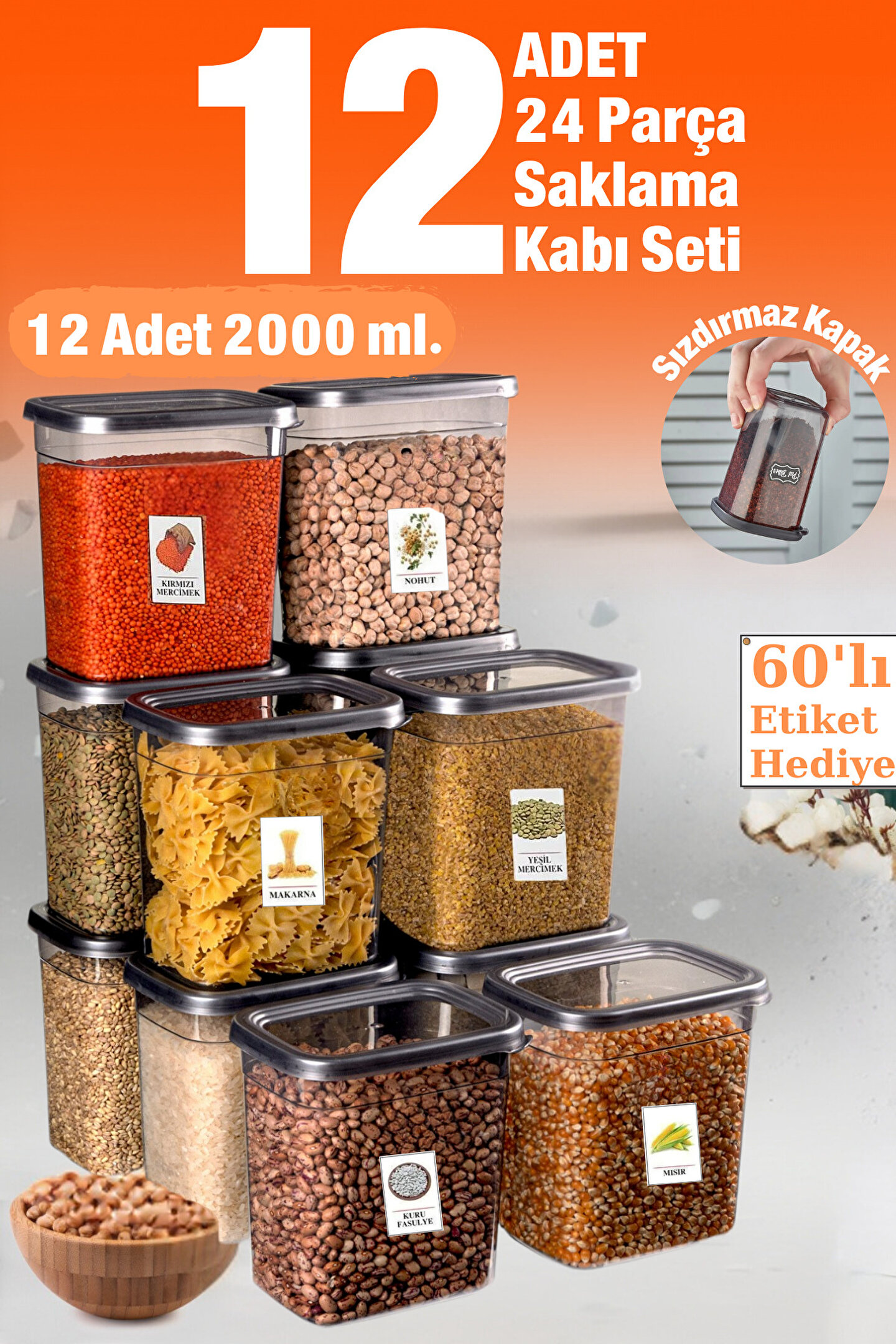 welcomein 12 Adet 24 Parça 2 Litre 2000 ml. Dikdörtgen Erzak Bakliyat Saklama Kabı Çeyiz Seti Etiket Hediyeli